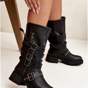 Model Ivaline 3644 to kozaki damskie o konstrukcji wsuwanej wykonane ze skóry ekologicznej w kolorze Black. Posiadają cholewkę sięgającą do połowy łydki o wysokości 28 cm oraz zamek boczny ułatwiający zakładanie. Ocieplenie i wkładka z koca obuwniczego ograniczają utratę ciepła w chłodne dni, zachowując jednocześnie miękkie dopasowanie do stopy. Obcas o wysokości 5 cm w formie klocka wykonany jest z tworzywa o podwyższonej odporności ściernej, co podnosi stabilność kroku. Podeszwa z syntetycznej gumy charakteryzuje się dobrą przyczepnością do gładkich nawierzchni. Elementy konstrukcyjne obejmują ozdobne paski z metalowymi klamrami, które nadają profilowanym liniom cholewki wyrazisty charakter. Kozaki przeznaczone są do użytkowania miejskiego w warunkach jesienno-zimowych.