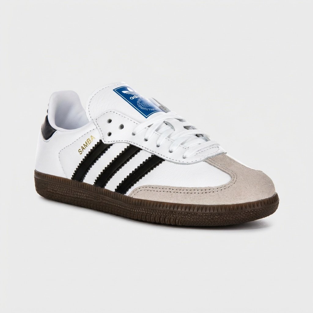 Kultiges Samba OG Modell in weißer Farbgebung mit charakteristischen schwarzen Streifen. Gefertigt aus Kunstleder und Textilmaterialien, ergänzt durch eine braune Gummisohle mit klassischem Muster.