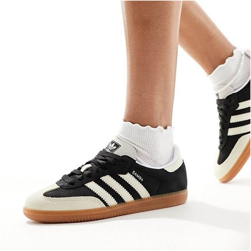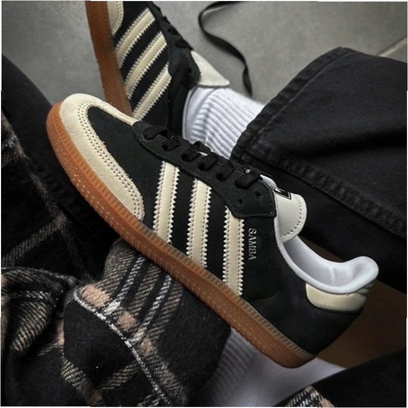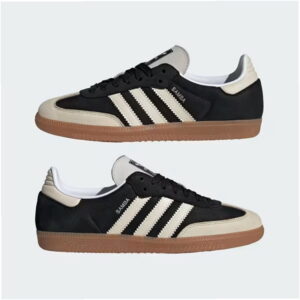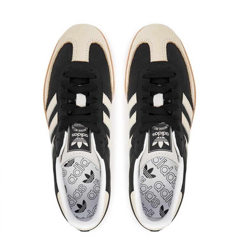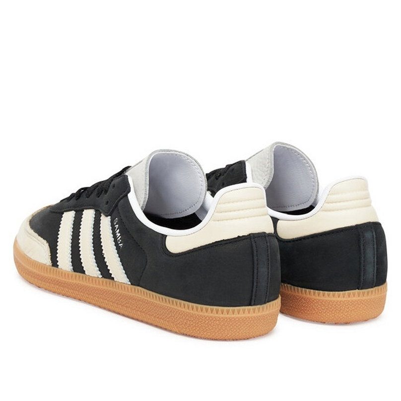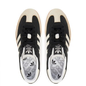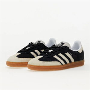 Das Modell Samba OG ist ein Lifestyle-Sneaker mit Obermaterial aus Naturleder und Wildlederpanels in Schwarz-Beige-Kolorit. Low-Top-Konstruktion mit charakteristischen drei Seitenbändern und goldener Samba-Schrift.