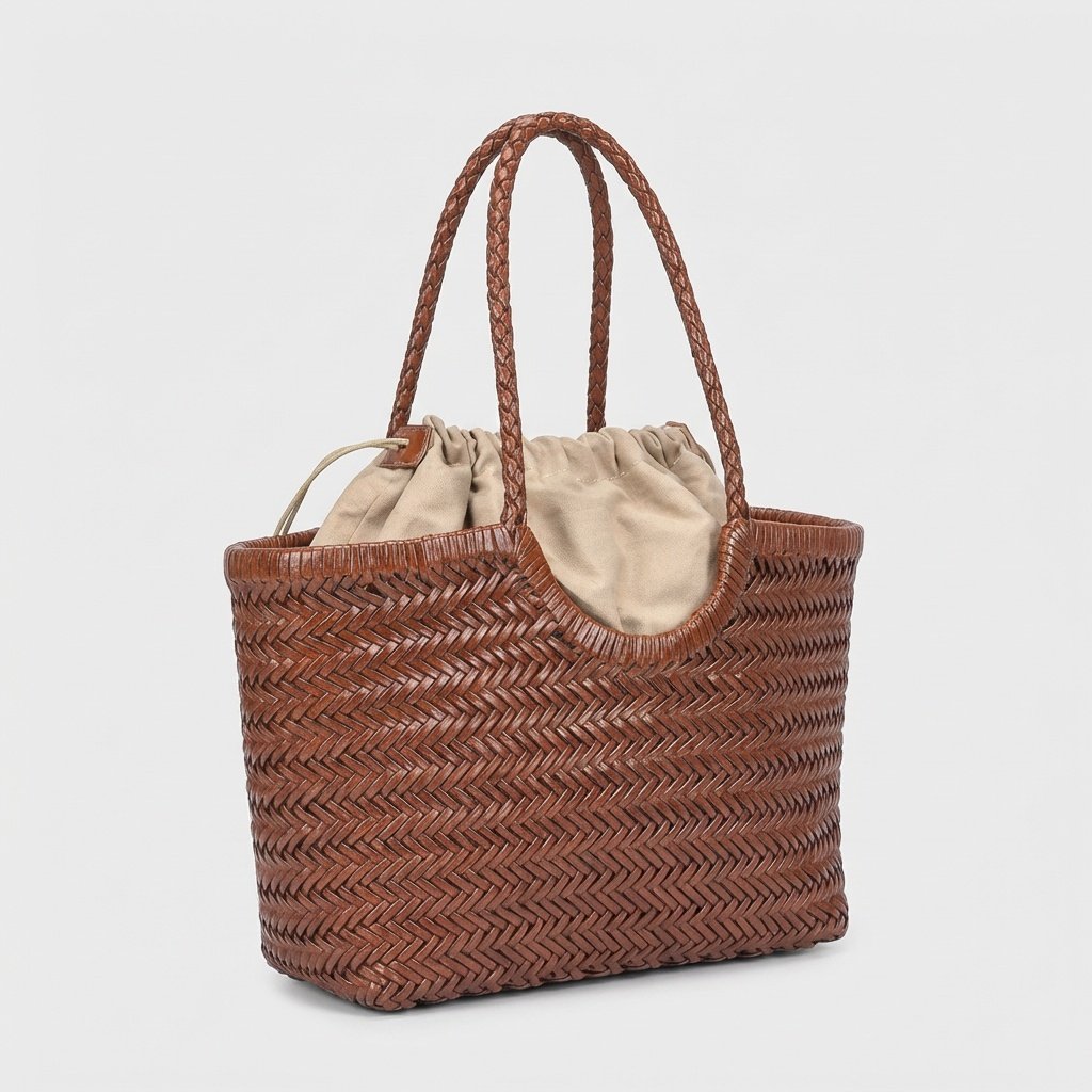 Shopper Bag in braunem Farbton aus natürlichem Rindsleder in traditioneller Fischgrätflechtung. Die Tasche zeichnet sich durch handwerkliche Verarbeitung und Lederdetails aus. Der Innenteil aus Polyestermaterial wird mit Kordeln verschlossen und bildet einen funktionalen Beutel.