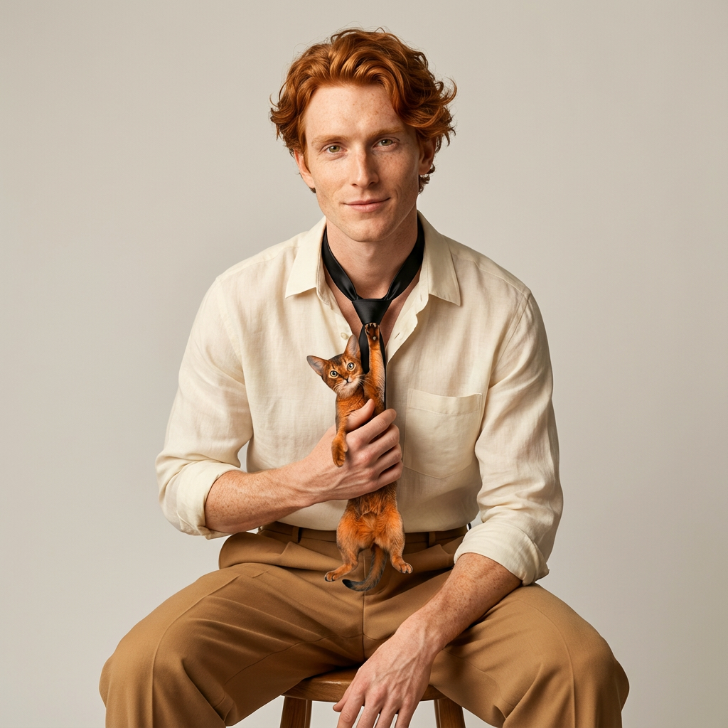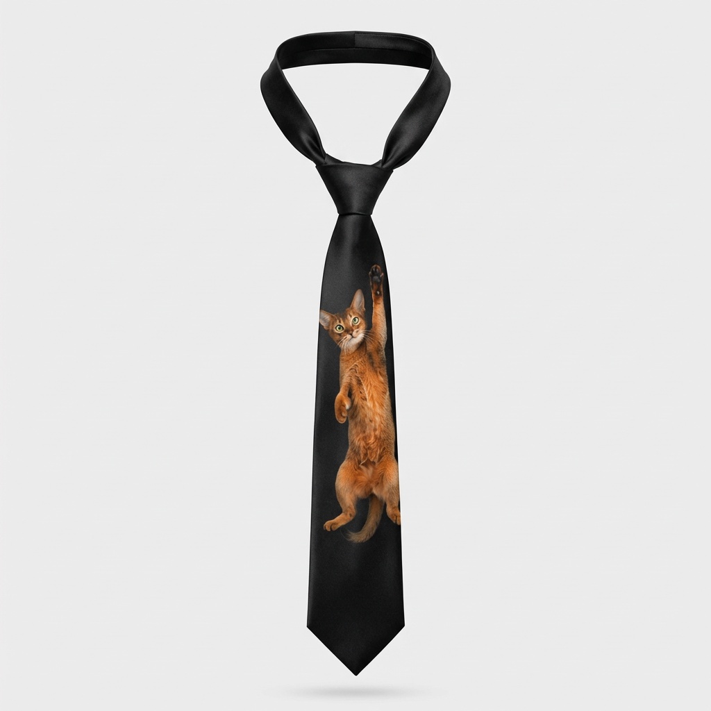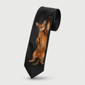 Die Designer-Krawatte präsentiert einen realistischen 3D-Print einer Abessinierkatze in dynamischer hängender Pose auf schwarzer Satinbasis. Die rote Katze mit charakteristischem Ticking-Fell, ausdrucksstarken grünen Augen und spitzen Ohren bildet ein Statement-Piece für Katzenliebhaber. Gefertigt aus glattem Polyestergewebe mit farbechten Farben, die ihre Farbintensität bewahren.