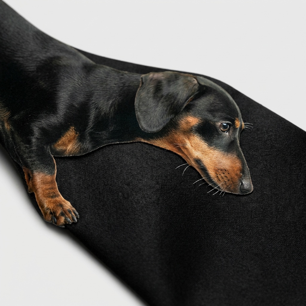 Designer-Krawatte mit realistischem 3D-Dackel-Print in klassischer schwarz-roter Färbung. Gefertigt aus glatter Premium-Polyester-Satinware mit widerstandsfähigen Farbstoffen, die die Farbintensität bewahren. Der charakteristische lange Dackelkörper geht fließend aus der schwarzen Krawattenbasis hervor und schafft eine stimmige Komposition, die durch warme Brand-Akzente durchbrochen wird.
