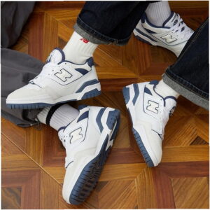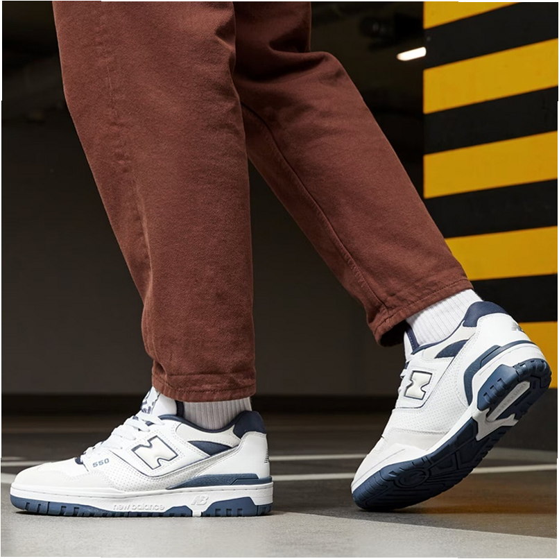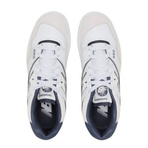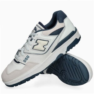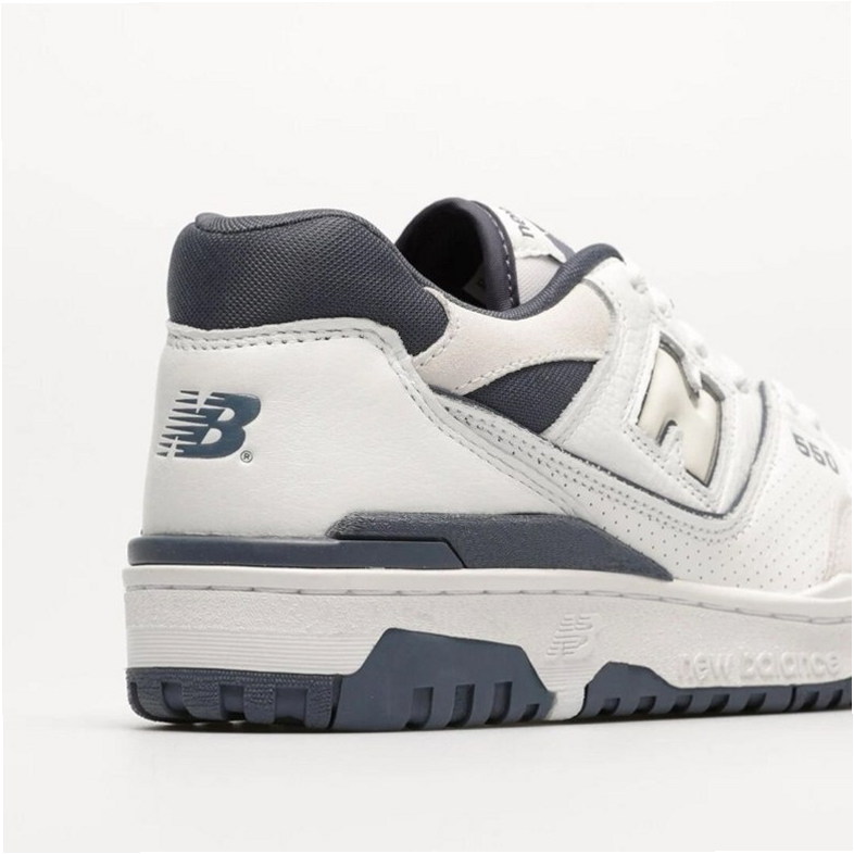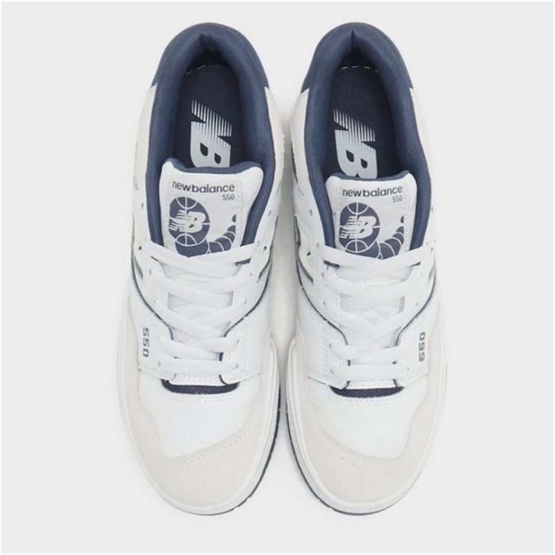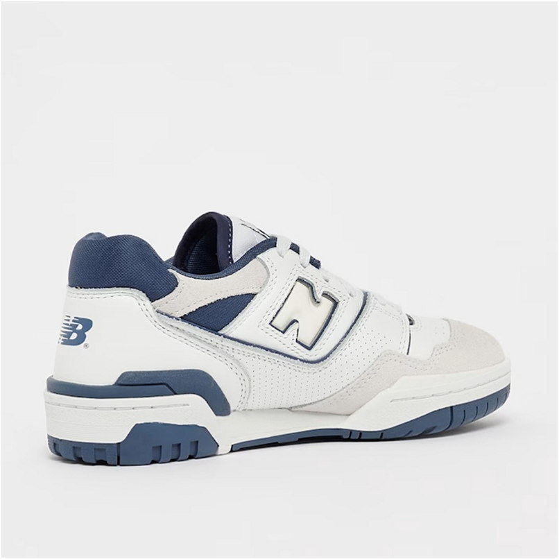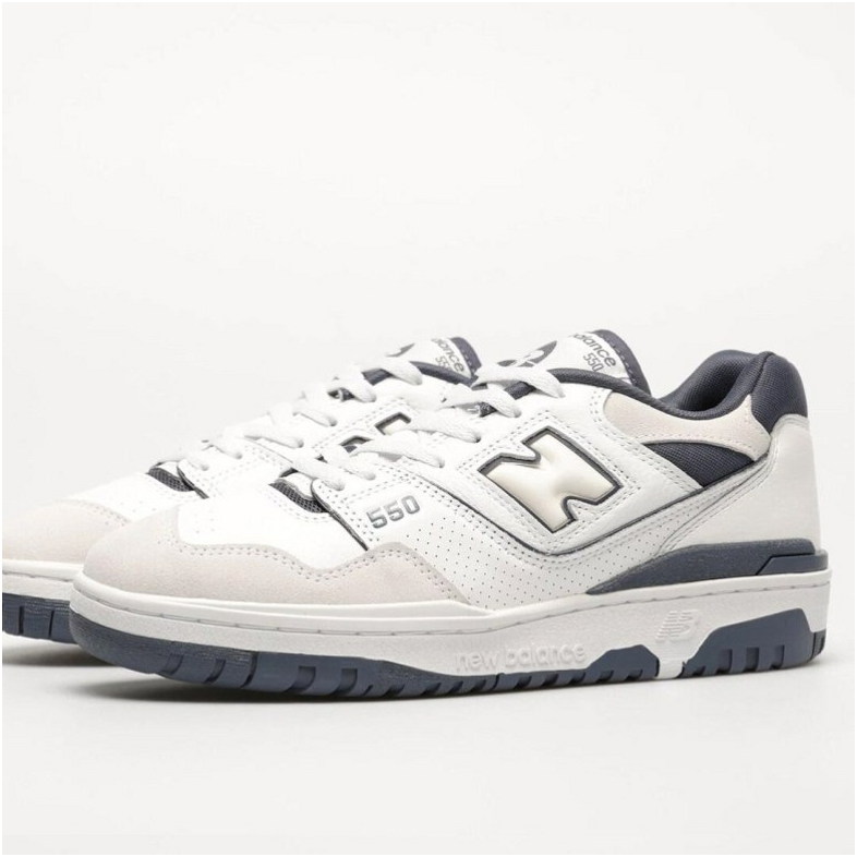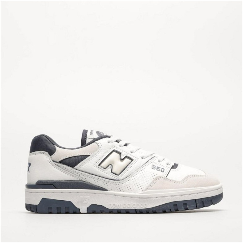 Das Modell 550 ist ein Lifestyle-Sneaker mit Obermaterial, das Naturleder und Synthetik in der Farbgebung White/Grey kombiniert. Low-Top-Konstruktion mit charakteristischem großem N-Logo und Details im Vintage-Stil inspiriert von Basketballschuhen aus den 1980er Jahren.