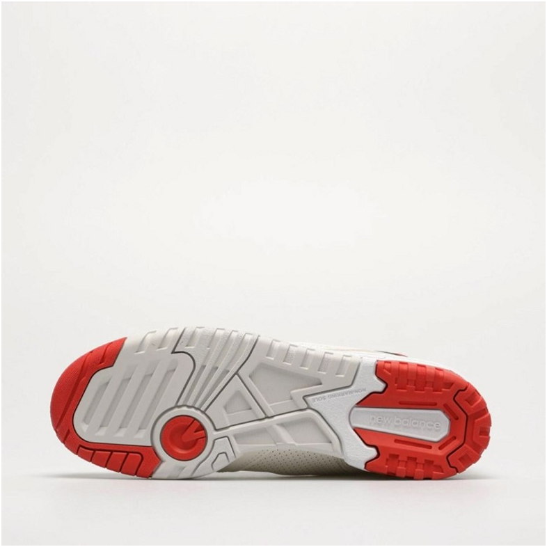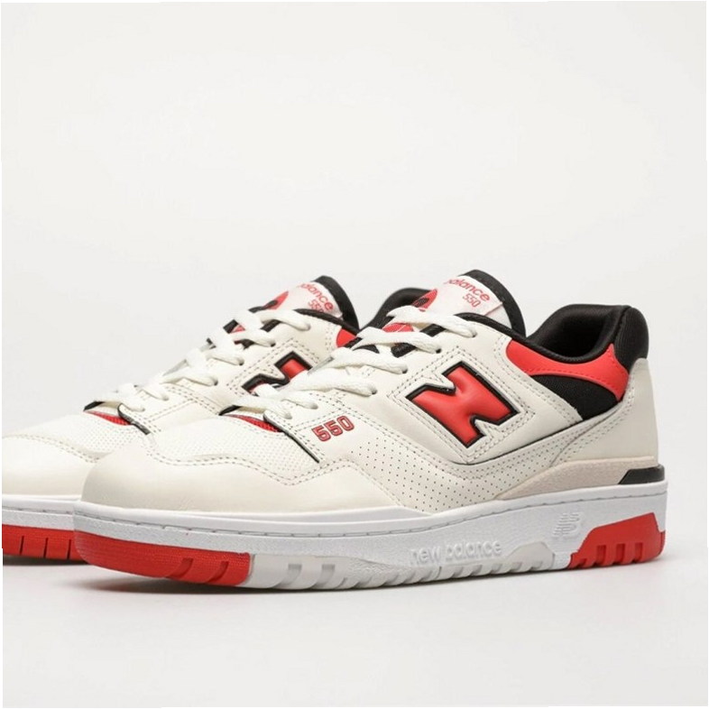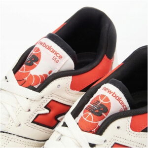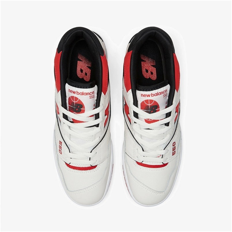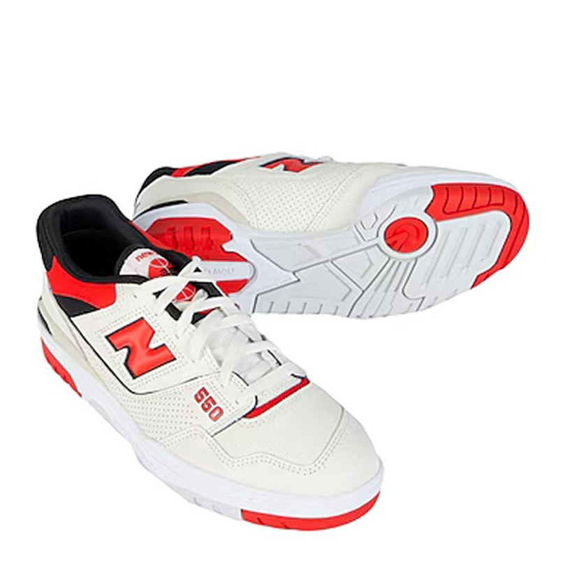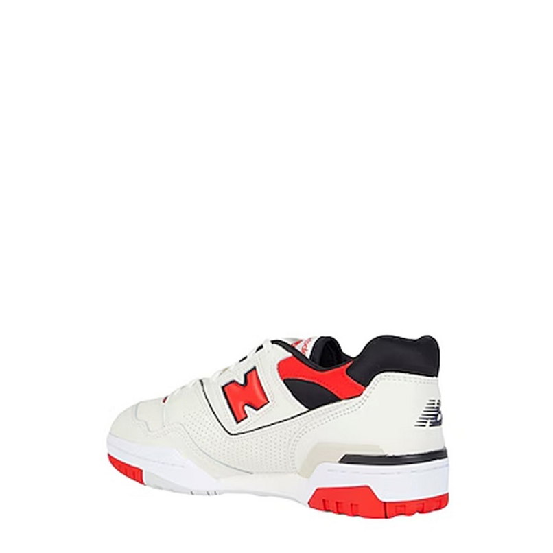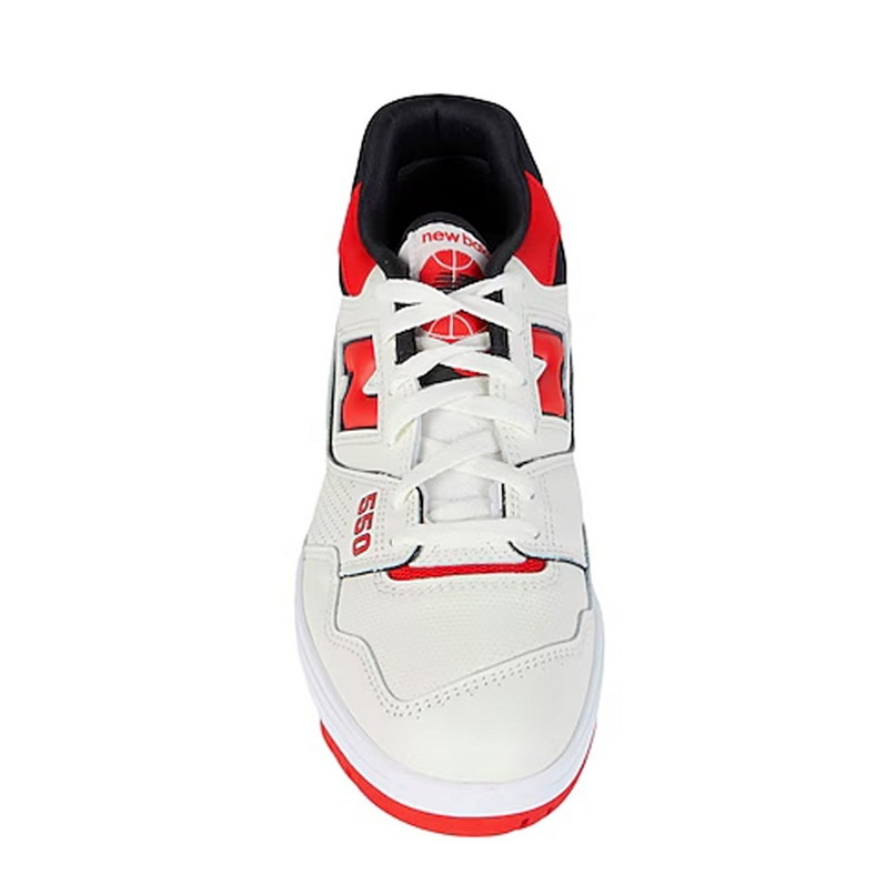 Das Modell 550 ist ein Lifestyle-Sneaker mit Obermaterial aus Natur- und Kunstleder in Weiß, ergänzt durch rote Akzente. Low-Top-Konstruktion mit ausgeprägtem „N“-Logo und Details inspiriert vom Basketball-Erbe der 1980er Jahre.