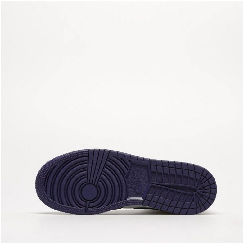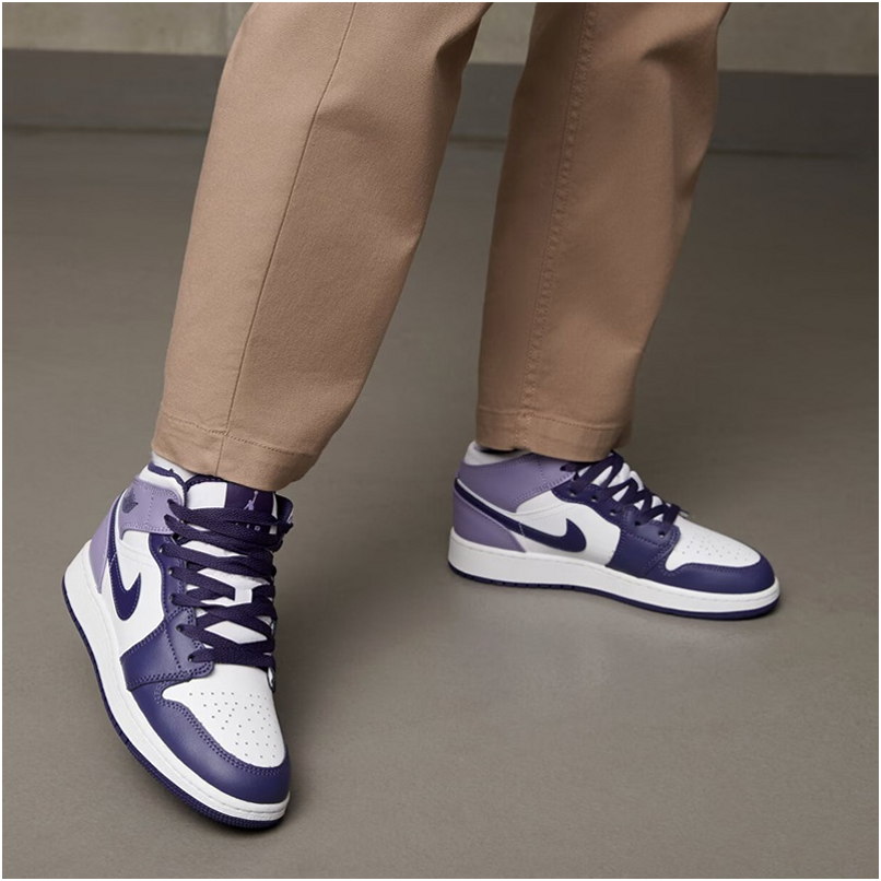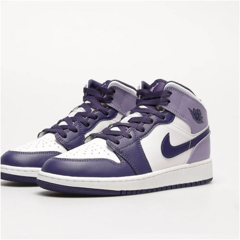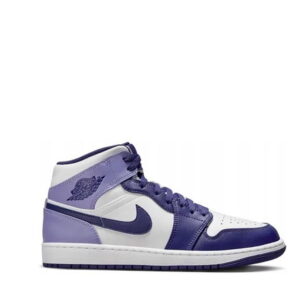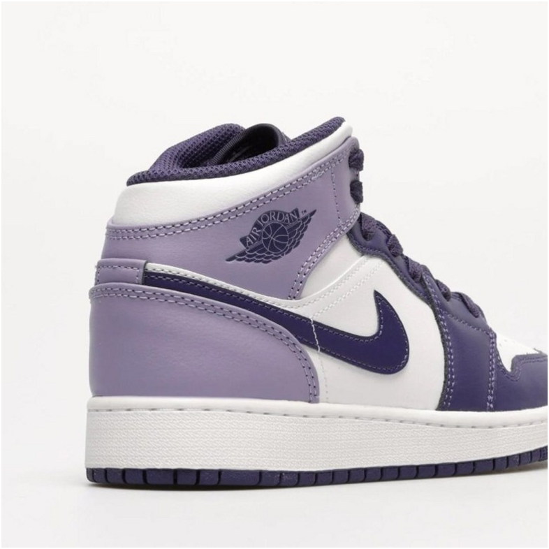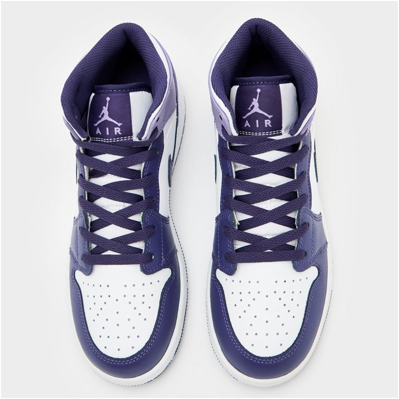 Das Modell Air Jordan 1 Mid ist ein Lifestyle-Sneaker mit Obermaterial, das Natur- und Kunstleder in Violett- und Weißtönen mit schwarzen Akzenten kombiniert. Mid-Cut-Konstruktion mit perforierter Zehenkappe und charakteristischen Air Jordan Flügeln.