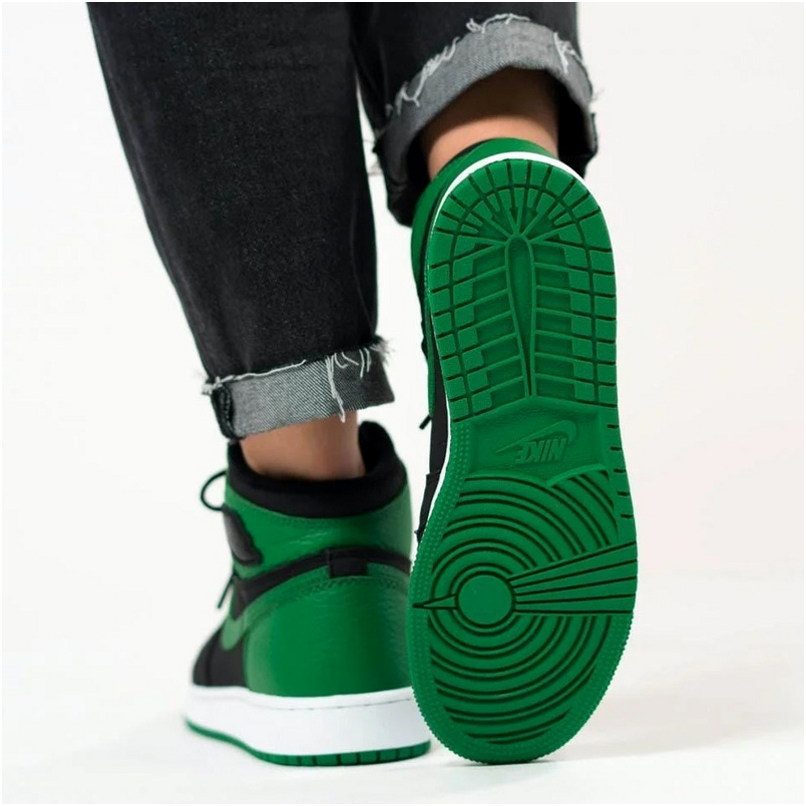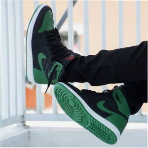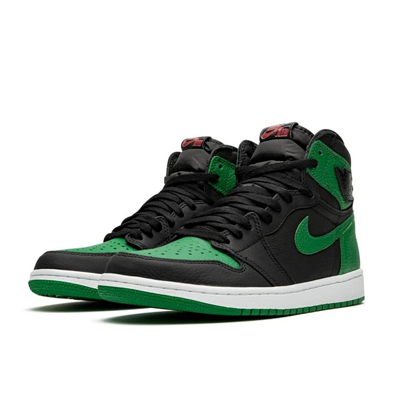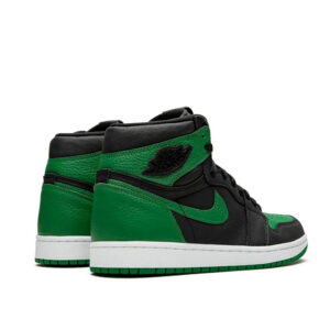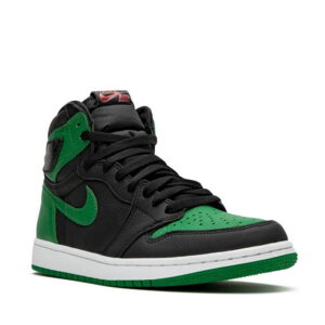 Das Modell Air Jordan 1 Retro High OG ist ein Basketball-Sneaker mit Obermaterial aus Naturleder in der Färbung Black/Green. High-Top-Konstruktion mit charakteristischem Air Jordan Wings-Logo und Nike Swoosh auf den Seitenpanelen.