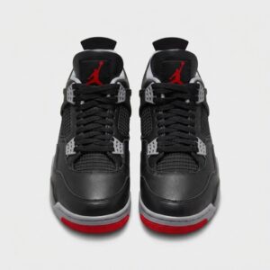 Kultschuhe Air Jordan 4 in der „Bred“ Farbgebung – schwarzes Leder mit roten Akzenten. Charakteristisches Mesh am Vorderfuß und sichtbare Air-Dämpfung in der Sohle. Klassisches Design der Basketball-Legende in neuer Ausführung.