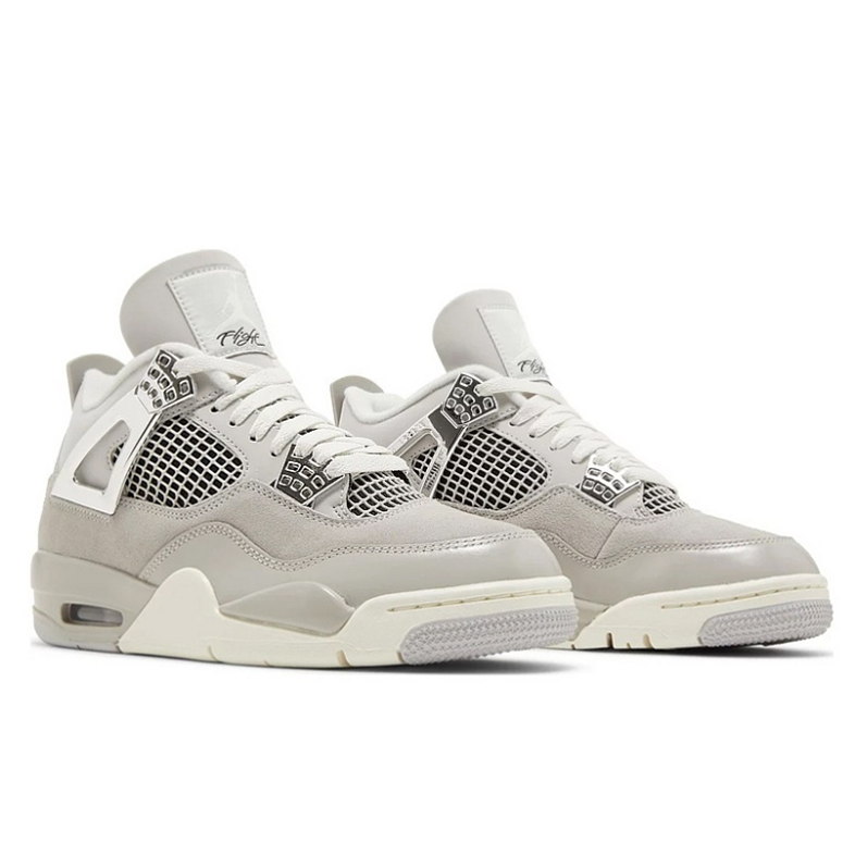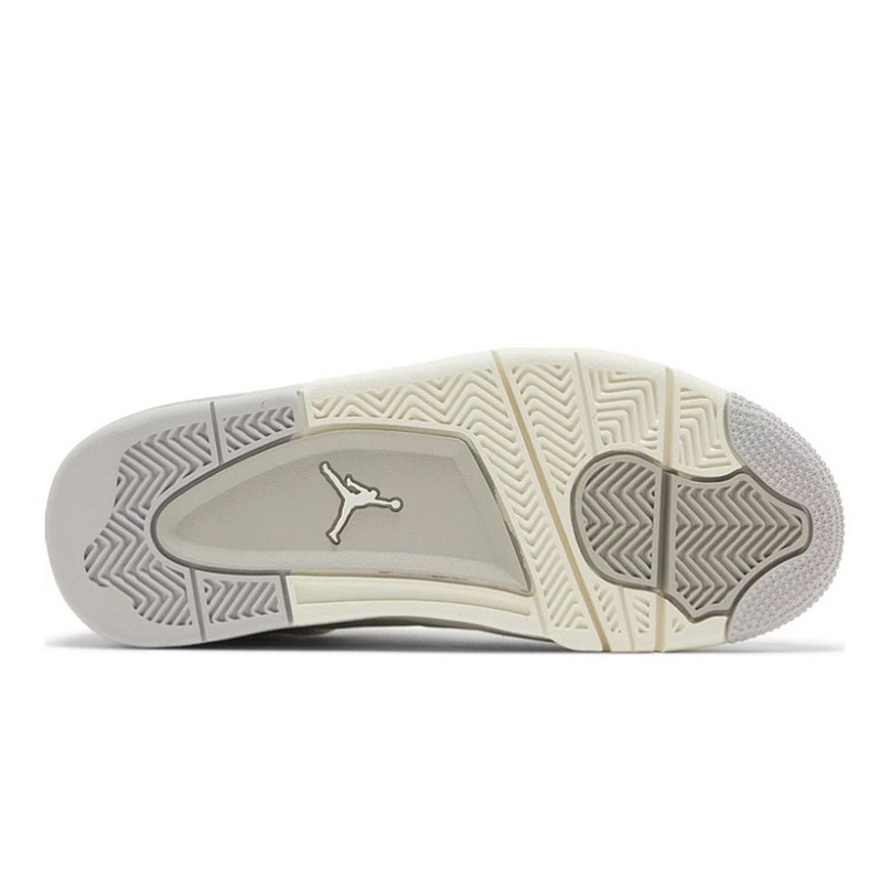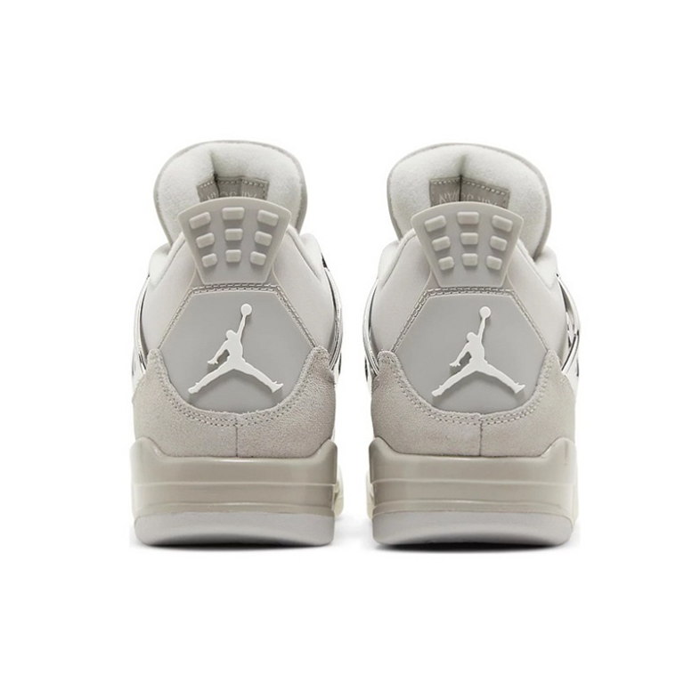 Das Modell Air Jordan 4 Retro ist ein Lifestyle-Sneaker mit Schaftbereich, der Naturleder und Kunstmaterialien in gedämpfter grauer Farbgebung kombiniert. Die Mid-Cut-Konstruktion wurde 1989 von Tinker Hatfield mit charakteristischen seitlichen Netzpanelen und stabilisierenden Flügelstabilisatoren des Schnürsystems entworfen.