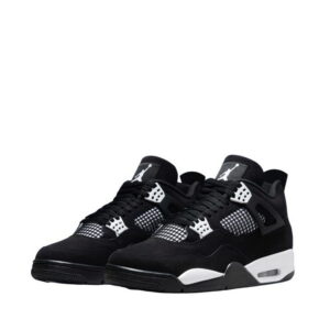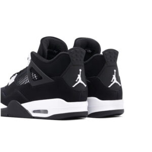 Das Modell Air Jordan 4 Retro ist ein Lifestyle-Sneaker mit Obermaterial, das Naturleder und Synthetikwerkstoffe in schwarzer Farbgebung kombiniert. Die Mid-Cut-Konstruktion mit charakteristischem seitlichem Netzgewebe und Flügelelementen des Schnürungssystems wurde 1989 von Tinker Hatfield entworfen.