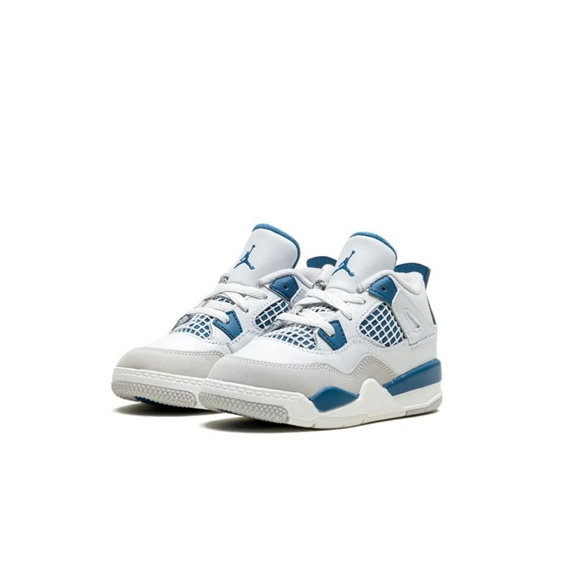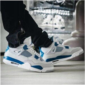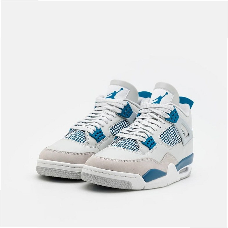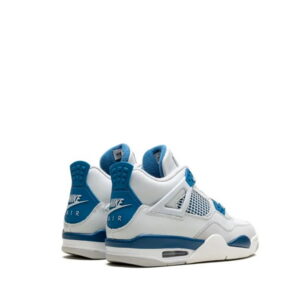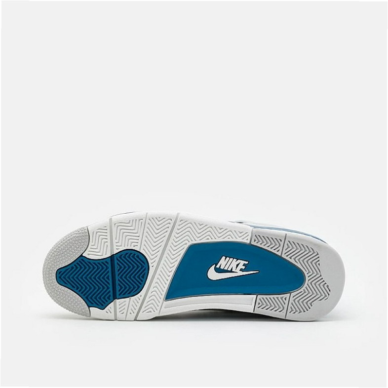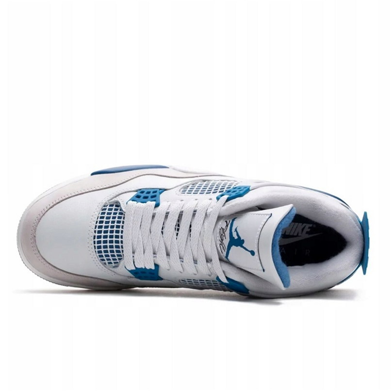 Das Modell Air Jordan 4 Retro ist ein Lifestyle-Sneaker mit Obermaterial, das Natur- und Kunstleder auf weißer Basis mit kontrastierenden blauen Details kombiniert. Mid-Top-Konstruktion mit charakteristischem seitlichen Mesh und stabilisierenden Flügeln zur Schnürverstärkung.