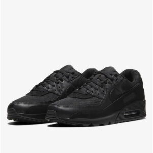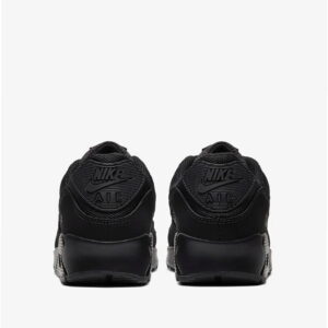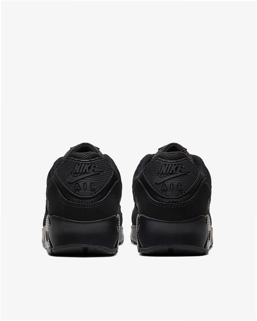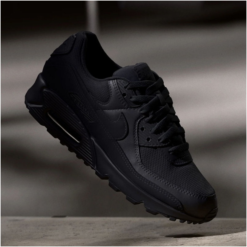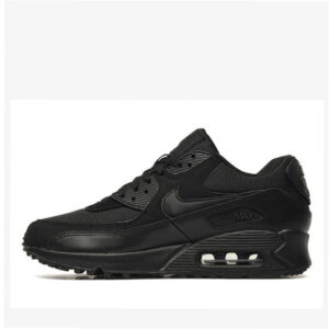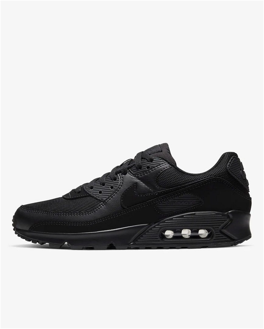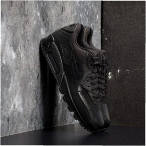 Das Modell Air Max 90 ist ein Lifestyle-Sneaker mit Schaft, der Naturleder, Wildlederpaneele und Mesh-Gewebe in durchgehend schwarzer Farbgebung verbindet. Die 1990 von Tinker Hatfield entworfene Konstruktion zeichnet sich durch eine dynamische Linienführung und solide Verarbeitung aus.