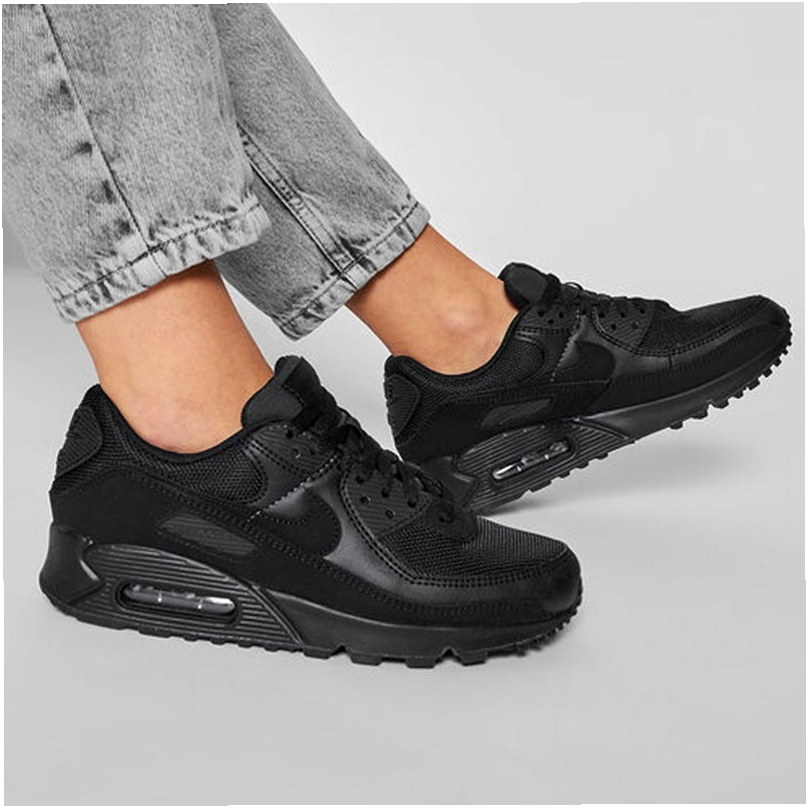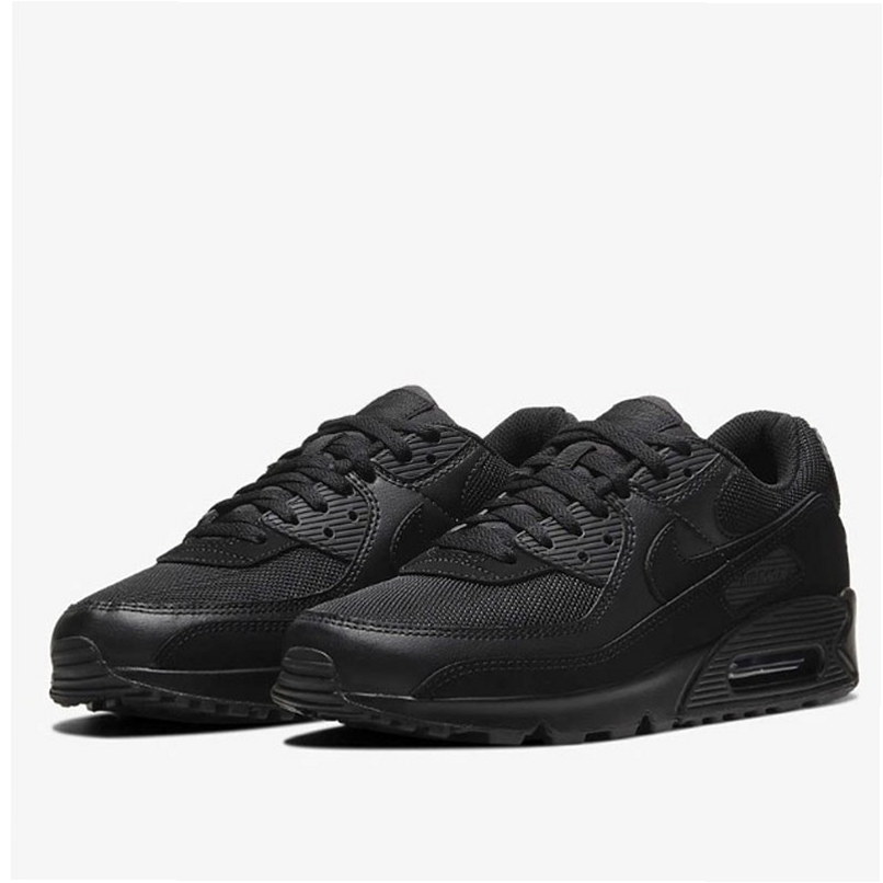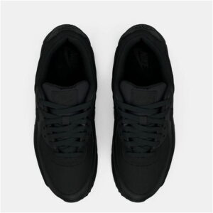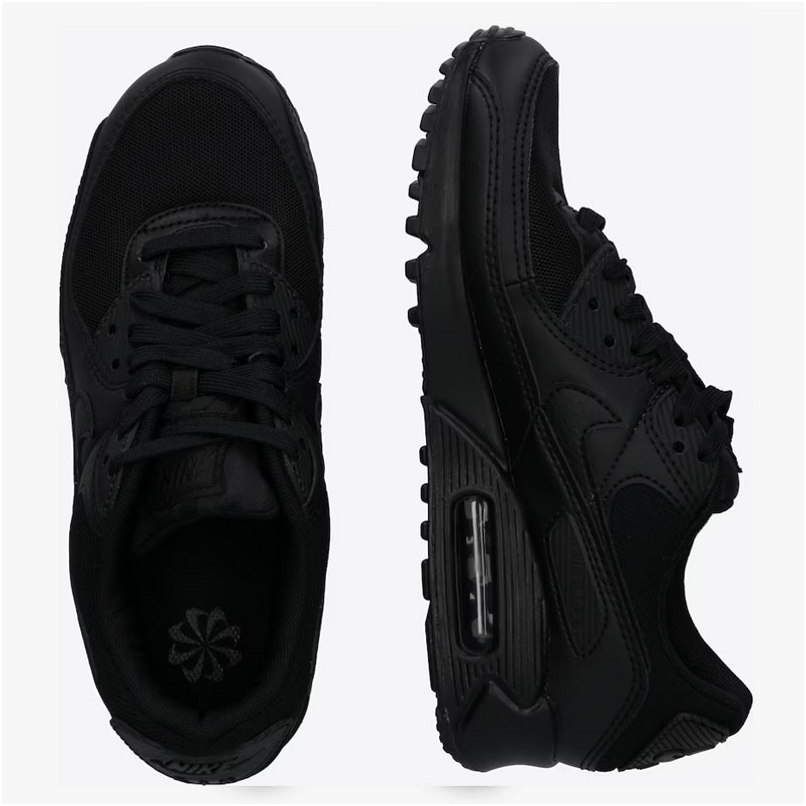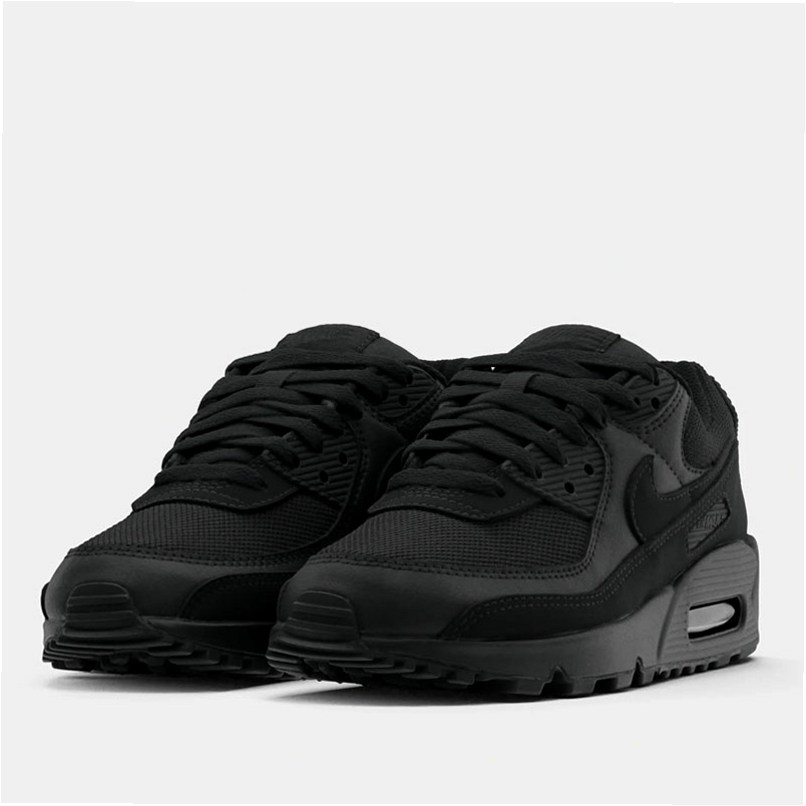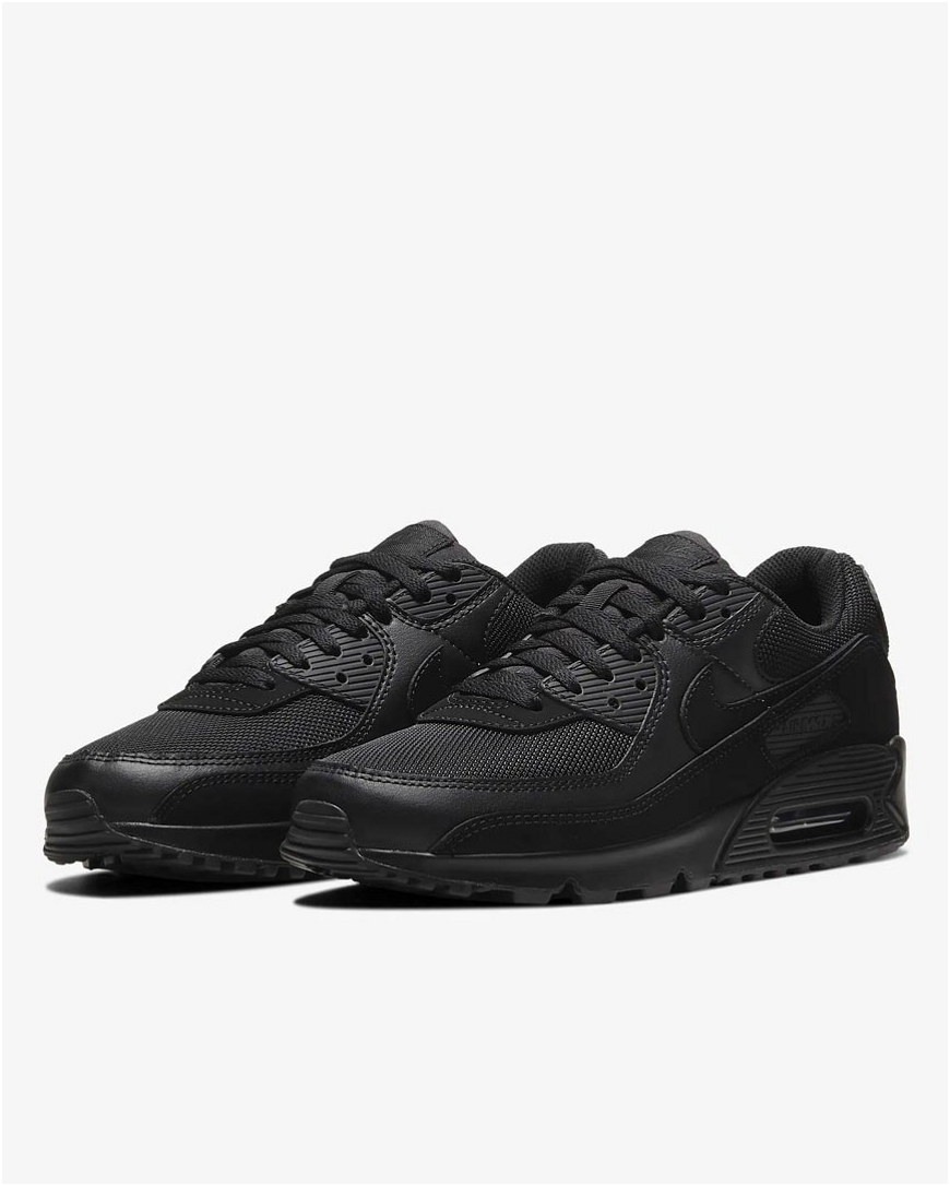 Das Modell Air Max 90 ist ein Lifestyle-Sneaker mit Schaft, der Naturleder, Wildlederpaneele und Mesh-Gewebe in durchgehend schwarzer Farbgebung verbindet. Die 1990 von Tinker Hatfield entworfene Konstruktion zeichnet sich durch eine dynamische Linienführung und solide Verarbeitung aus.