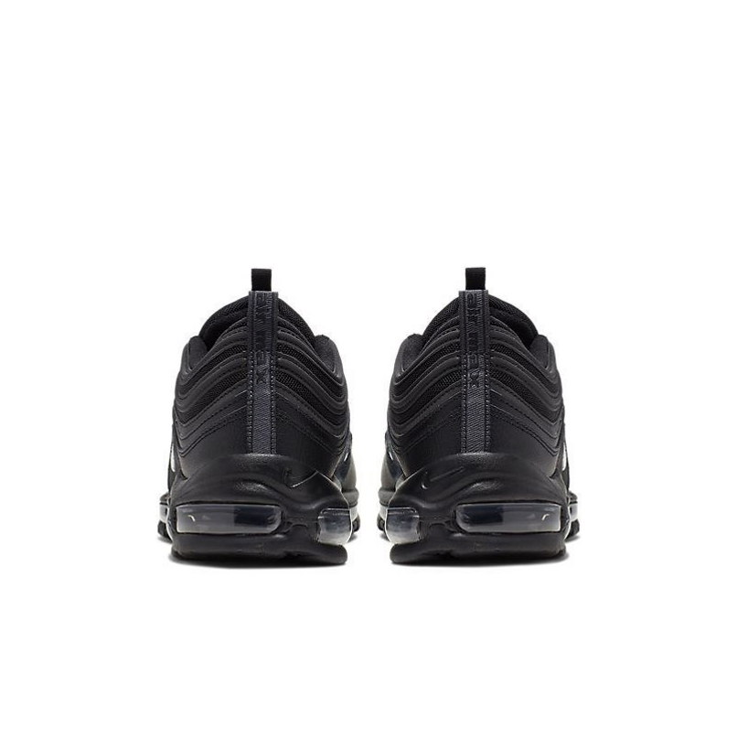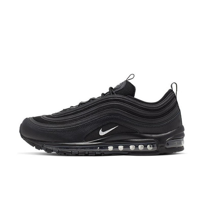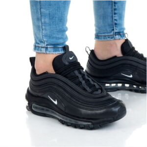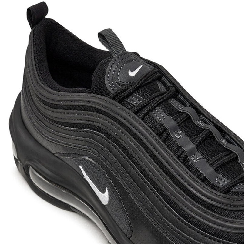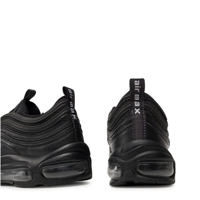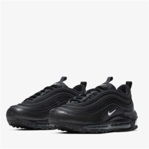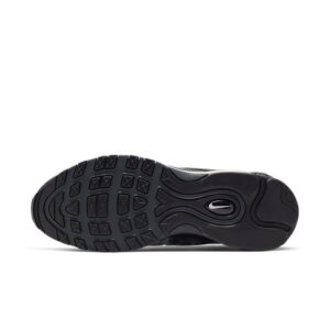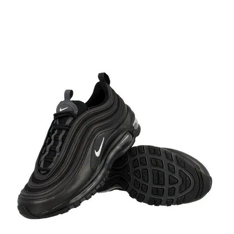 Das Modell Air Max 97 ist ein Lifestyle-Sneaker mit Schaft aus Synthetikmaterialien, Naturleder und Mesh-Gewebe in komplett schwarzer Farbgebung. Die Konstruktion zeichnet sich durch wellenförmige Linien aus, die sich über die gesamte Länge des Schuhs erstrecken, sowie durch ein futuristisches Profil, das von der ästhetischen Ausstrahlung der 1990er Jahre inspiriert ist.