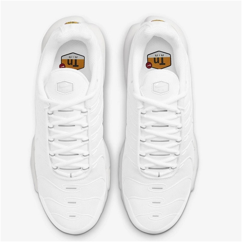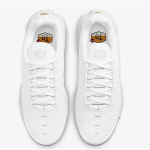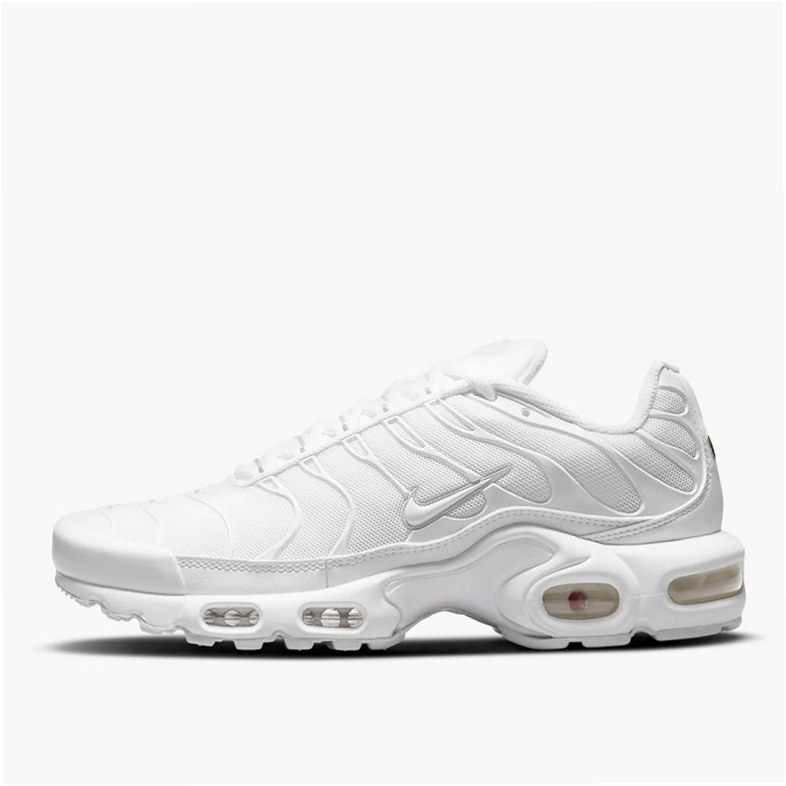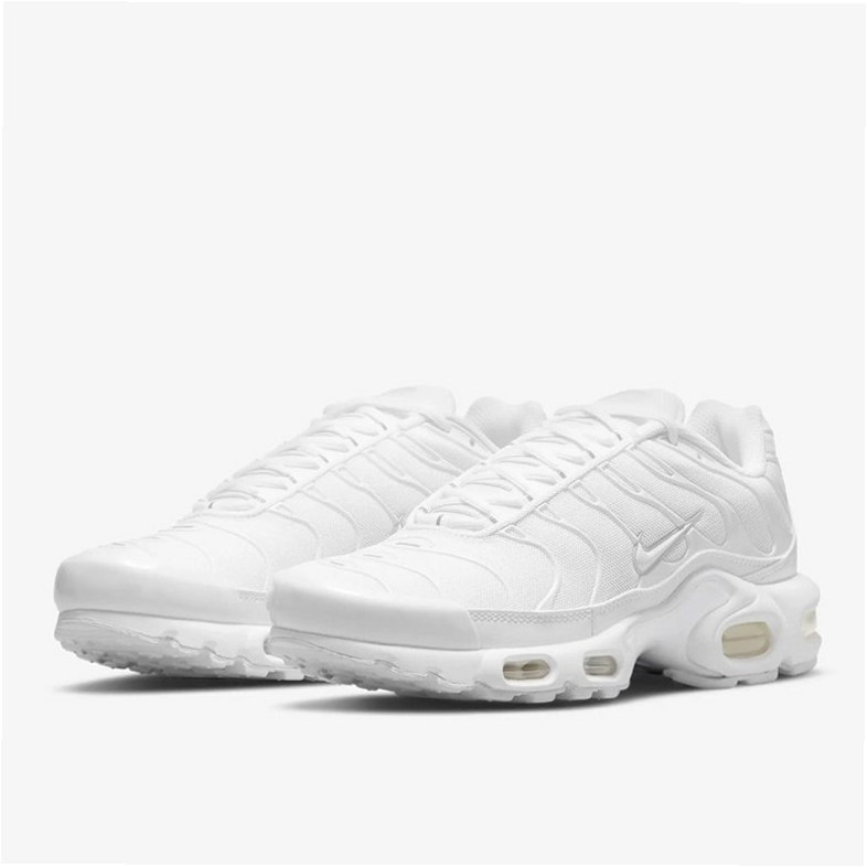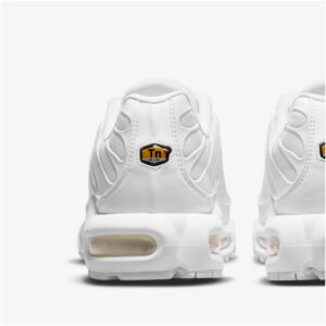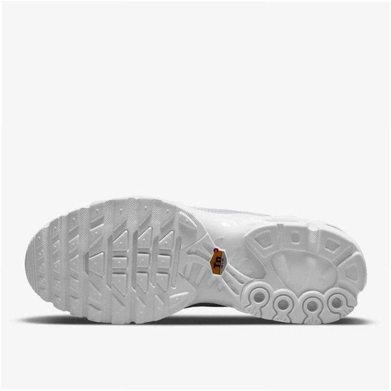 Das Modell Air Max Plus TN ist ein Lifestyle-Sneaker mit einem Schaft, der synthetische Paneele und Mesh-Gewebe in weißer Farbgebung kombiniert. Die Konstruktion verfügt über charakteristische Wellenlinienmuster und TPU-Verstärkungen.