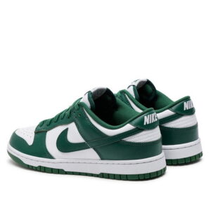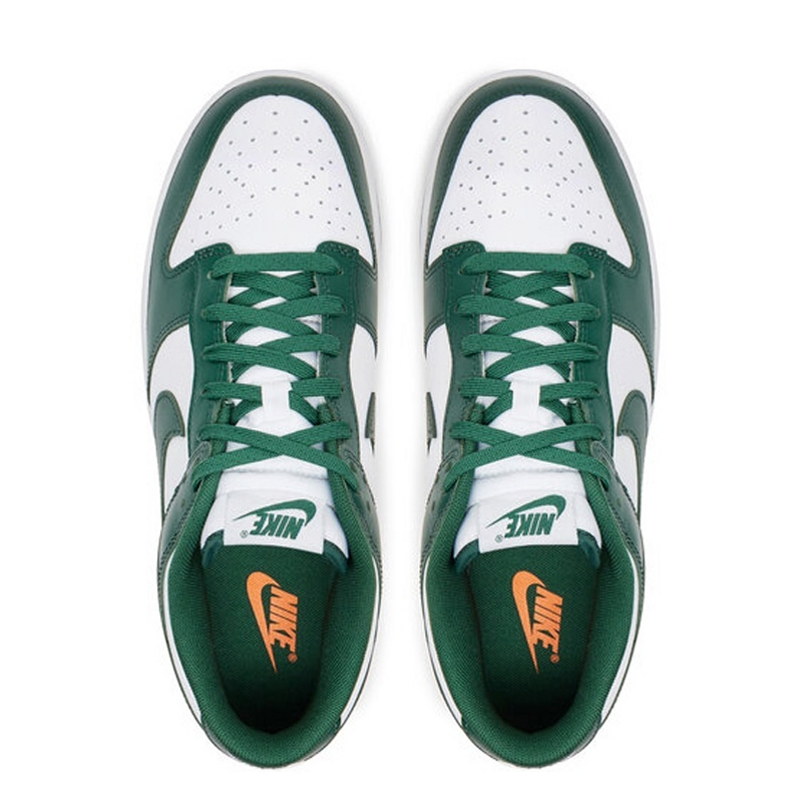 Das Modell Dunk Low ist ein Lifestyle-Sneaker mit Obermaterial aus Naturleder und Kunststoffen in der Farbgebung Green/White. Low-Top-Konstruktion mit retro-Basketballsilhouette und charakteristischem Swoosh-Logo auf dem Seitenpaneel.