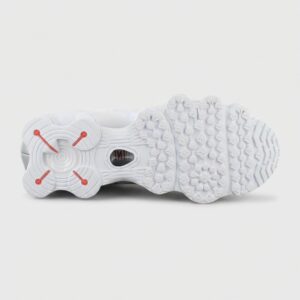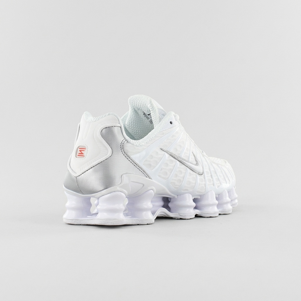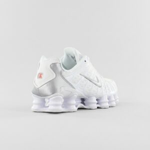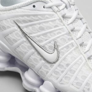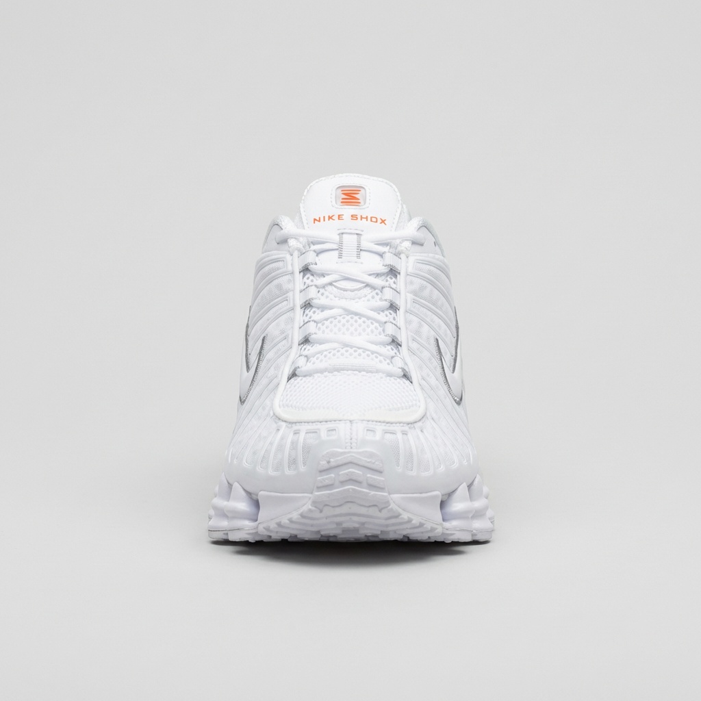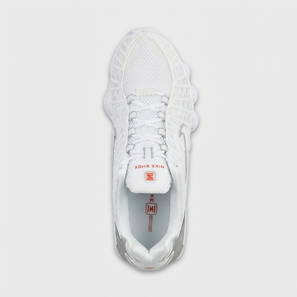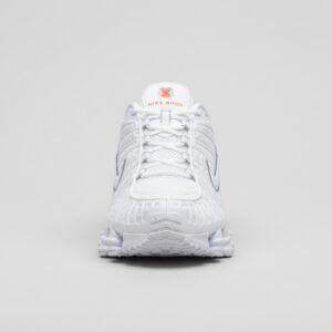 Nike Shox TL sind klassische Sportschuhe, die sich durch ihre charakteristische Sohle mit Shox-Säulen auszeichnen. Die weiße Farbgebung wird durch metallische Details in Silber und orangefarbene Akzente ergänzt. Hergestellt aus einer Kombination von Textilmaterial und Kunststoffen bieten sie Langlebigkeit und Funktionalität.