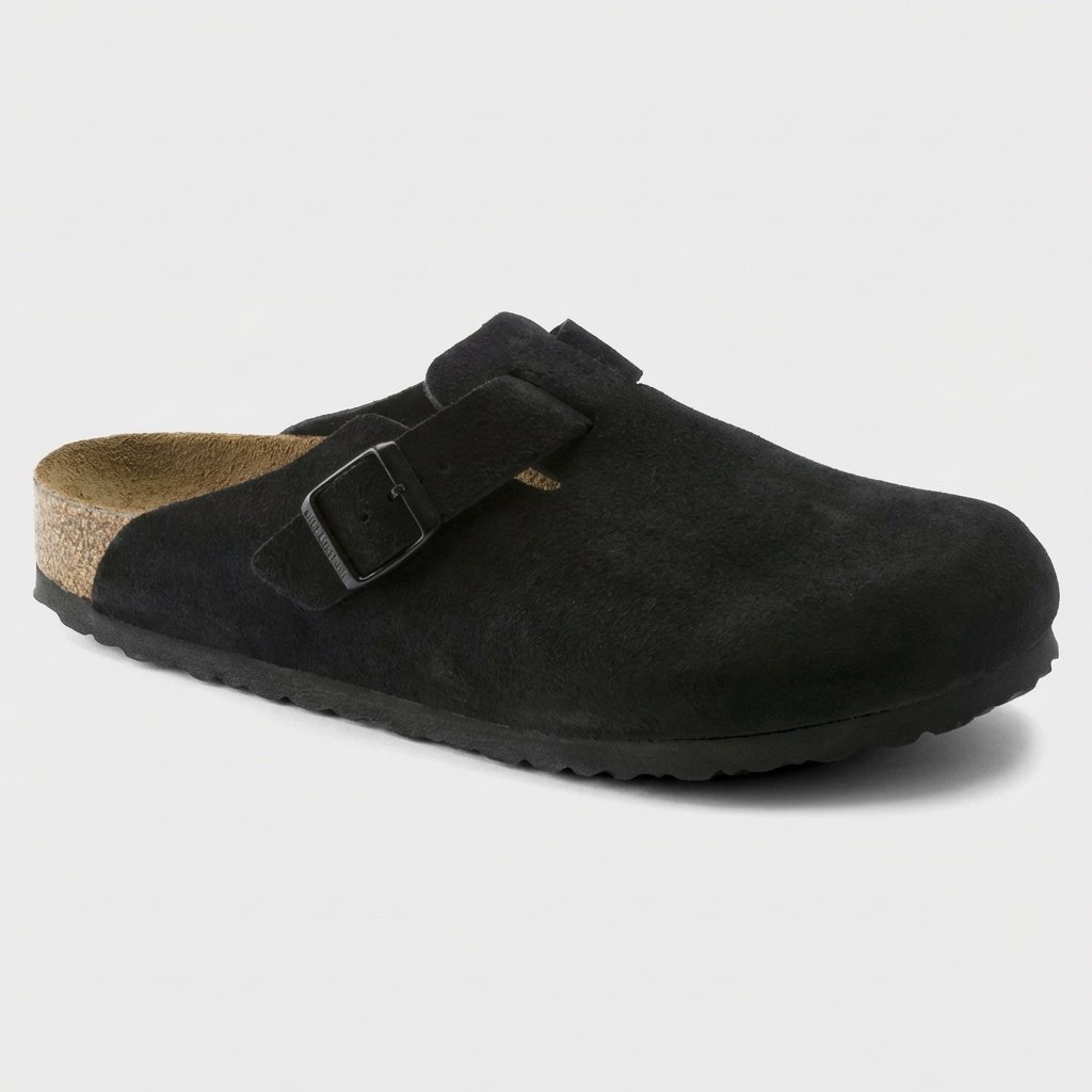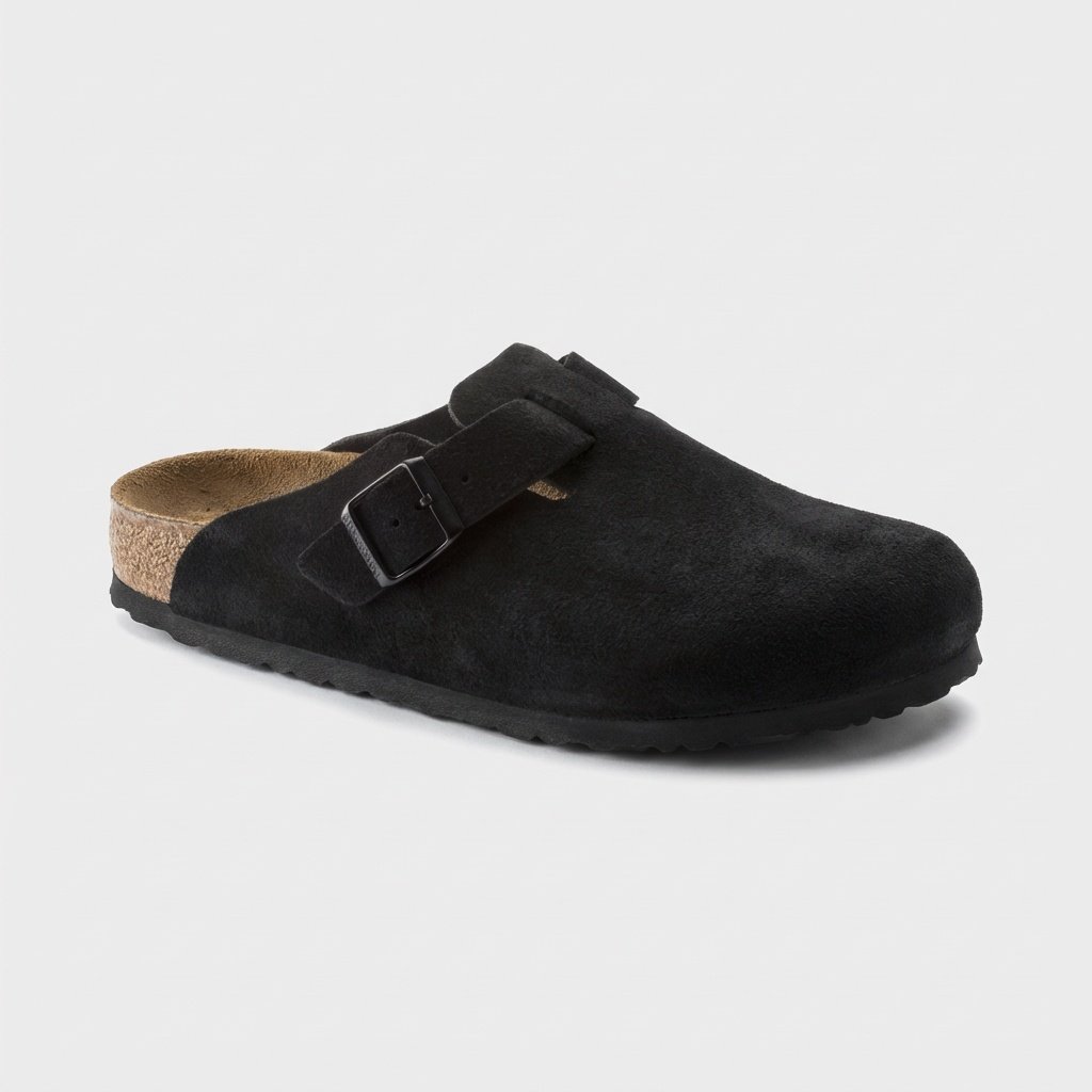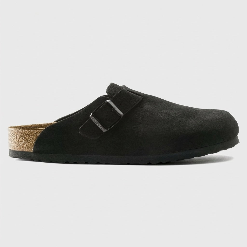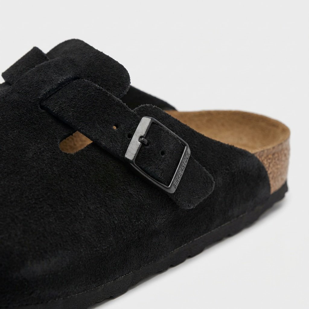 Die Pantoletten Boston SFB gehören zu den bekanntesten Modellen der Marke Birkenstock. Gefertigt aus hochwertigem Wildleder in tiefem Schwarz, ausgestattet mit verstellbarer Metallschnalle. Die anatomische Sohle aus Naturkork mit Latex passt sich der Fußform an.
