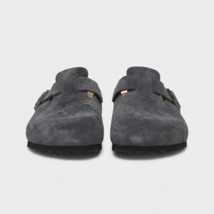 Die Pantoletten Boston SFB verbinden minimalistisches Design mit der Funktionalität geschlossener Zehen. Gefertigt aus weichem Wildleder in Grauton, ausgestattet mit verstellbarer Metallschnalle und charakteristischer Sohle aus Naturkork. Das Modell bietet Tragekomfort dank anatomisch profilierter Einlage, die sich der Fußform anpasst.