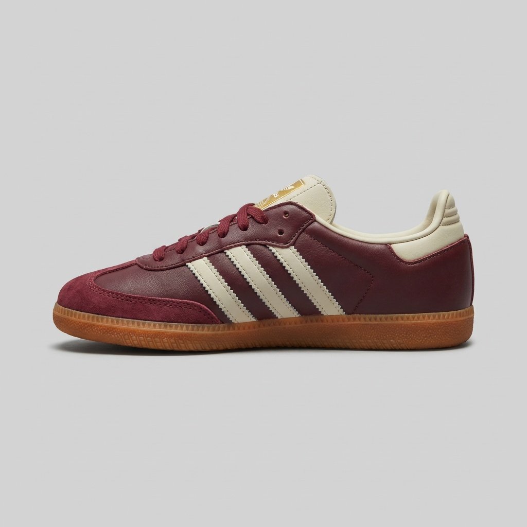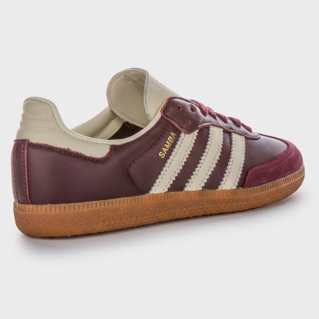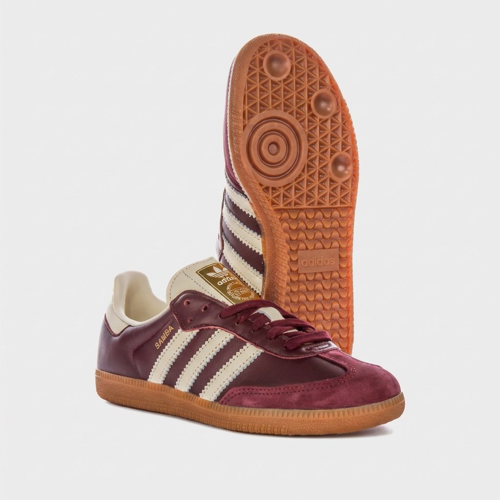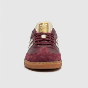 SAMBA OG harmoniert perfekt mit Jeans und lässigen urbanen Outfits. Passt zu Chinos, Joggern und Shorts und schafft vielseitige Alltagskombinationen. Die bordeaux Farbe harmoniert mit neutralen Tönen: Beige, Grau und Schwarz.