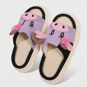 Zapatillas de casa para mujer con diseño de vacas en tonos morado, rosa y beige. Confeccionadas en suave tejido de algodón que garantiza comodidad al caminar. La adorable aplicación floral con ojitos bordados añade un carácter femenino.