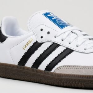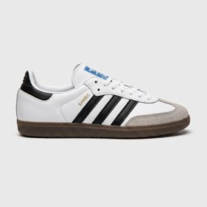 Las Adidas Samba OG son un modelo clásico de sneakers que durante décadas sigue siendo símbolo del estilo deportivo. El upper blanco contrasta con las tres rayas negras de la marca, creando una estética reconocible. Los detalles grises en la puntera y el talón añaden carácter al conjunto.