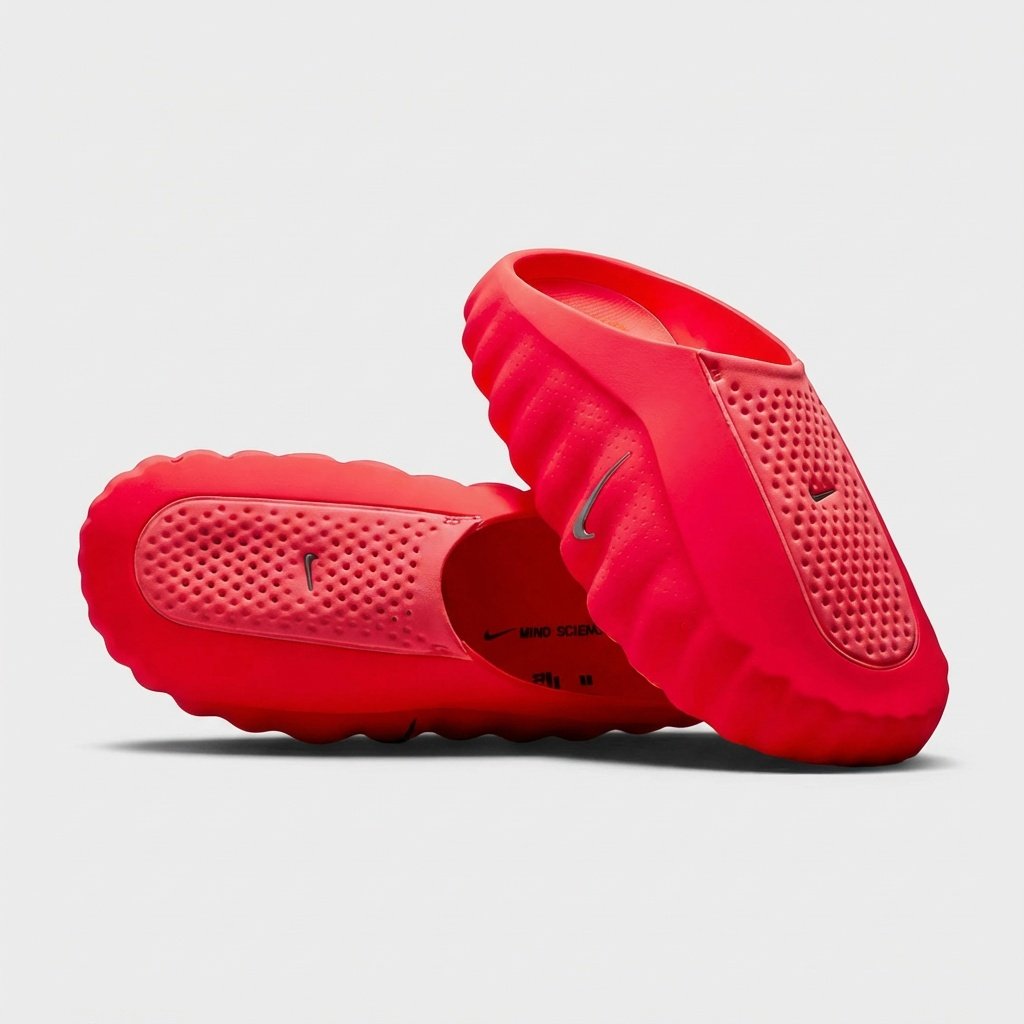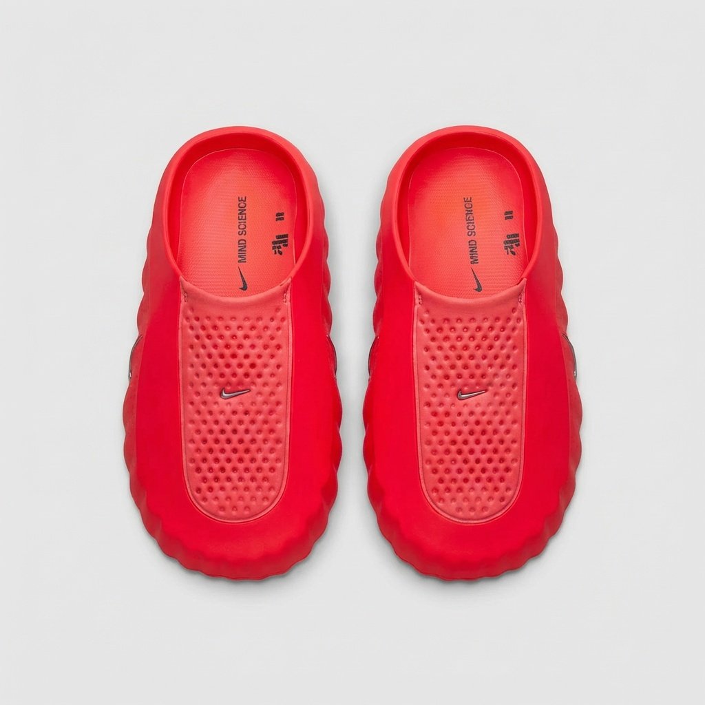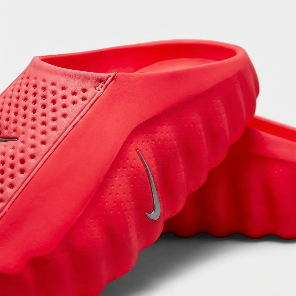Las chanclas Nike Mind 001 se distinguen por su intenso color rojo Solar Red y silueta futurista. La plantilla perforada asegura la ventilación de los pies, mientras que la suela exterior esculpida con relieves garantiza el agarre. La construcción de espuma EVA combina ligereza con durabilidad.