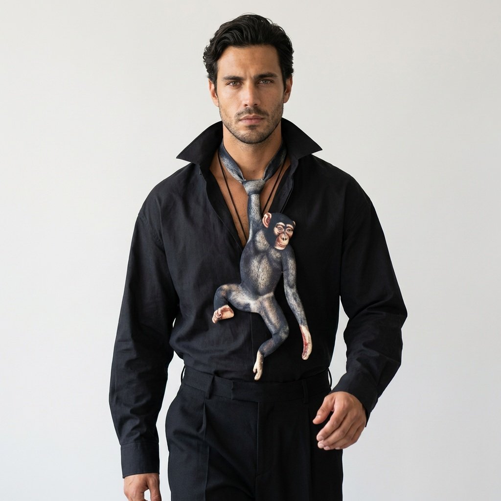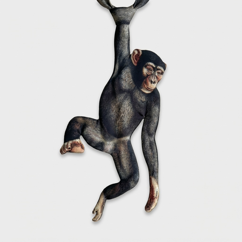 Corbata de diseño con estampado 3D realista de chimpancé en pose dinámica de escalada. Confeccionada en tejido satinado liso de poliéster resistente a las arrugas. Statement piece que combina el dress code formal con carácter expresivo.