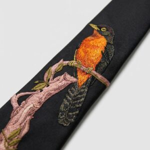 Corbata negra con pájaro bordado presenta una composición inspirada en ilustraciones naturalistas. El pájaro de pecho intensamente naranja y alas oscuras descansa sobre una rama rosa-marrón con hojas oliváceas. El tejido satinado de poliéster premium constituye un fondo elegante para el bordado preciso que reproduce cada detalle de las plumas.