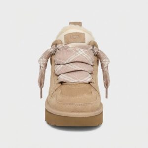 Las sneakers UGG Lowmel combinan la comodidad del uso diario con el diseño característico de la marca. Confeccionadas en ante de alta calidad en color arena, están equipadas con forro térmico y suela de plataforma. Los cordones decorativos con brillo metálico aportan un sutil acento estilístico al modelo.