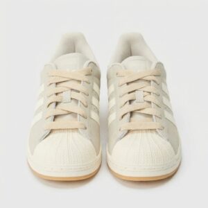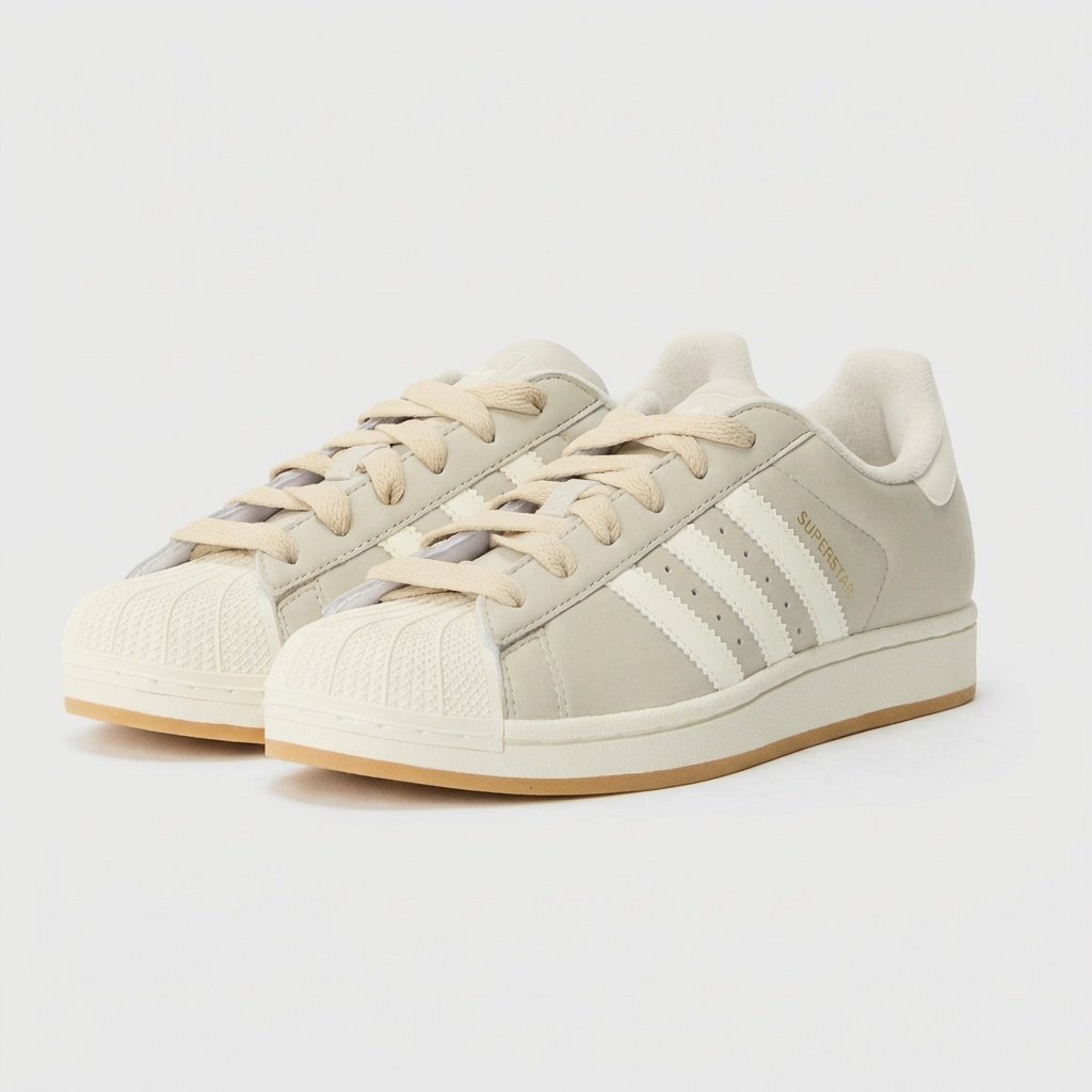 Icónicas sneakers ADIDAS Superstar II W en color Alumina combinan cuero beige con acentos crema. Característica puntera tipo concha y suela de goma con textura natural. Modelo unisex disponible en amplia gama de tallas.