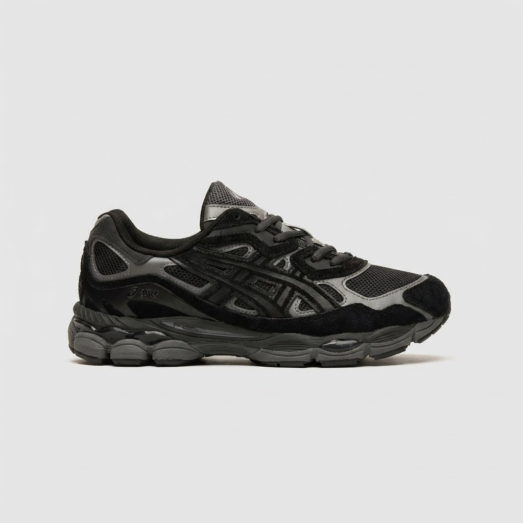 Zapatillas deportivas ASICS GEL-NYC que combinan diseño retro con moderna tecnología de amortiguación. Coloración multicolor en tonos de negro y gris con característica suela segmentada. Fabricadas con combinación de materiales textiles y sintéticos.