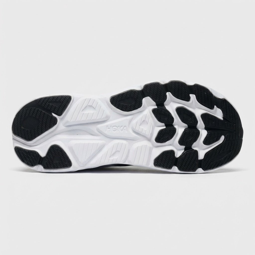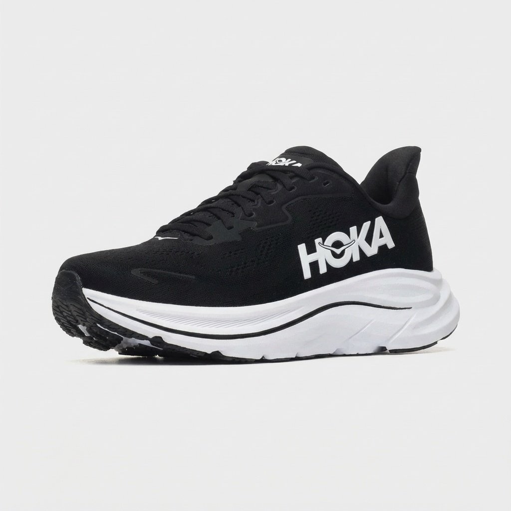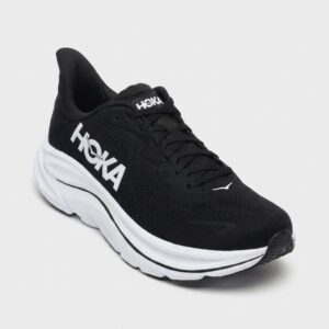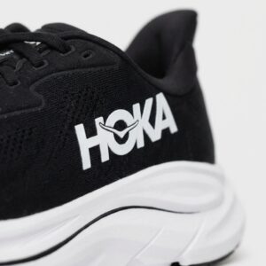 Las zapatillas de running HOKA Clifton 10 se distinguen por su suela intermedia gruesa que ofrece amortiguación efectiva durante el entrenamiento. El upper combina material textil con elementos sintéticos, proporcionando durabilidad y soporte al pie. El logo blanco contrastante de HOKA destaca sobre el fondo negro del upper.