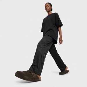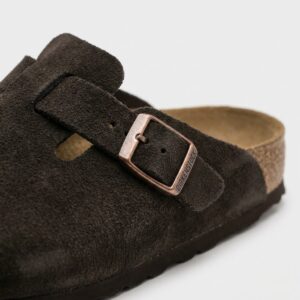 Los zuecos Boston SFB combinan comodidad con diseño minimalista. Fabricados en ante de alta calidad en tono mocha, equipados con la característica hebilla con acabado metálico en color cobre. La plantilla anatómica de corcho natural proporciona el soporte adecuado al arco del pie.