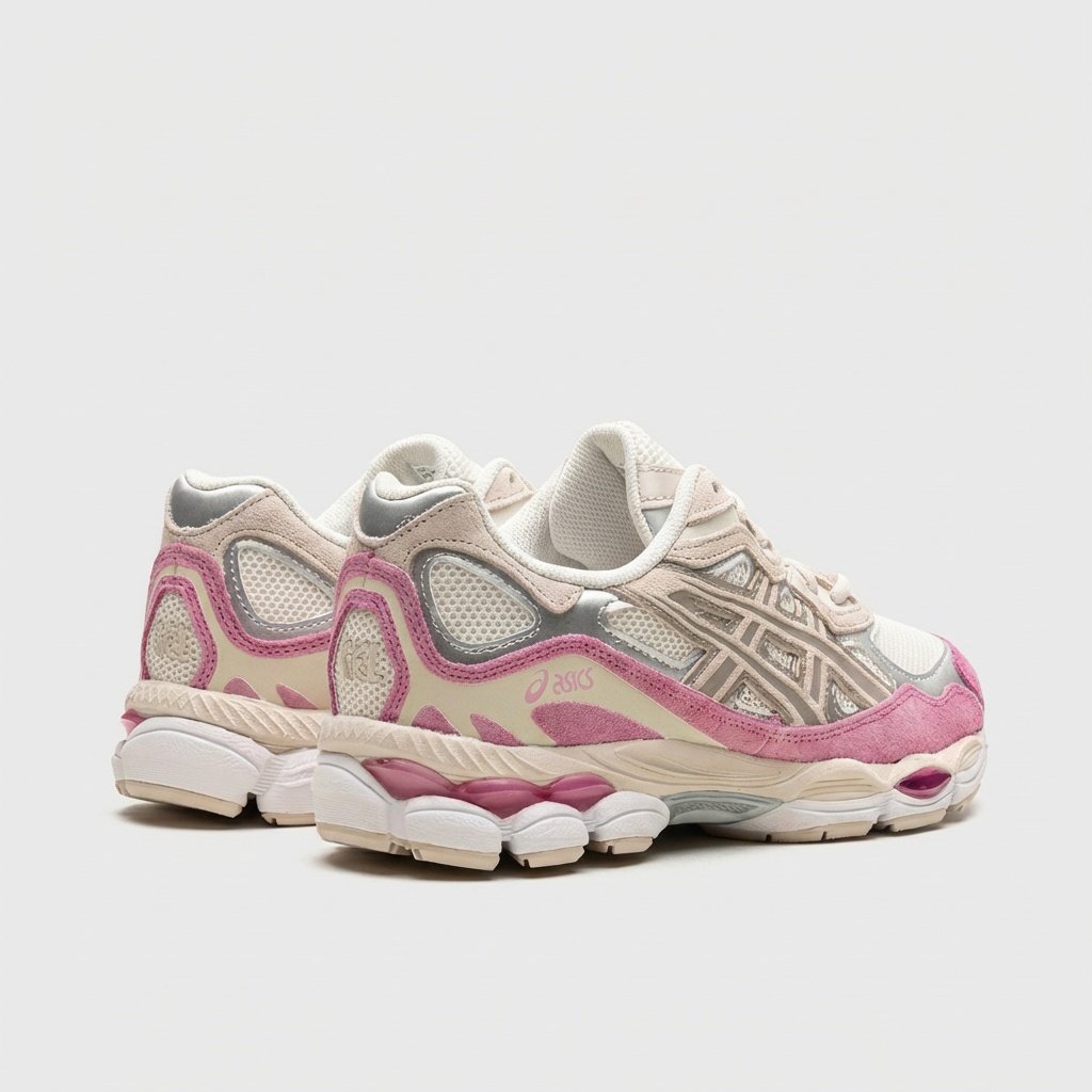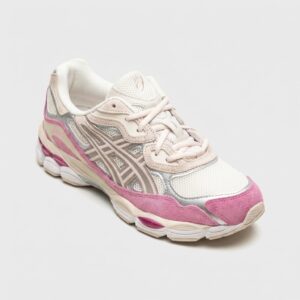 Baskets ASICS Gel-NYC dans les coloris cream, mineral beige et pink. Construction combinant matières textiles et inserts synthétiques. Semelle massive avec système d’amorti Gel assurant le confort au porté.