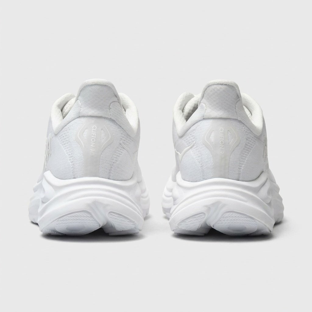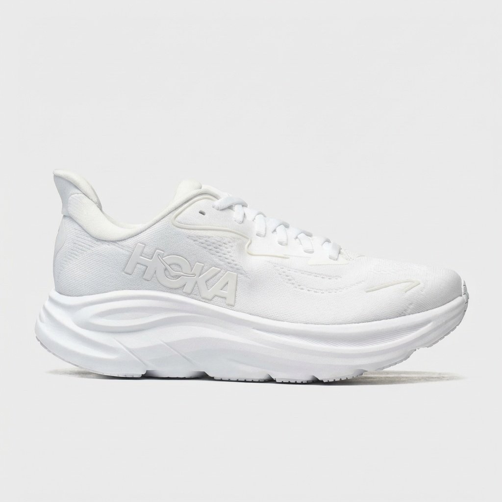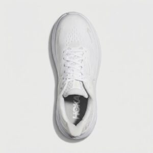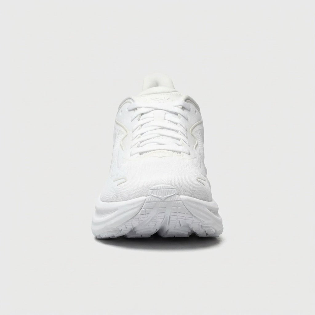 Chaussures de course HOKA Clifton 10 avec la semelle intermédiaire caractéristique Meta-Rocker. Construction en matière textile et synthétique assurant légèreté et ventilation. Coloris blanc s’accordant à diverses tenues sportives.