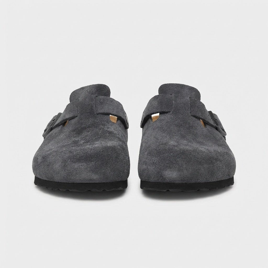 Les sabots Boston SFB allient design minimaliste et fonctionnalité du bout fermé. Confectionnés en daim souple dans une teinte grise, équipés d’une boucle métallique réglable et de la semelle caractéristique en liège naturel. Le modèle offre un confort de port grâce à la semelle anatomiquement profilée qui s’adapte à la forme du pied.