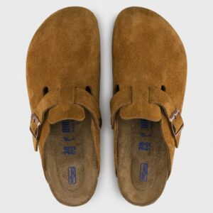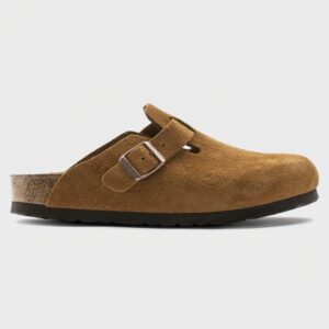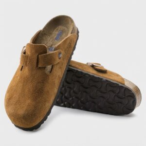 Le ciabatte Boston SFB sono una proposta iconica del marchio Birkenstock realizzata in morbido camoscio nella tonalità mink. Il modello è dotato di fibbia metallica regolabile e caratteristica suola in materiale EVA. La soletta anatomicamente profilata in sughero naturale e lattice si adatta alla forma del piede.