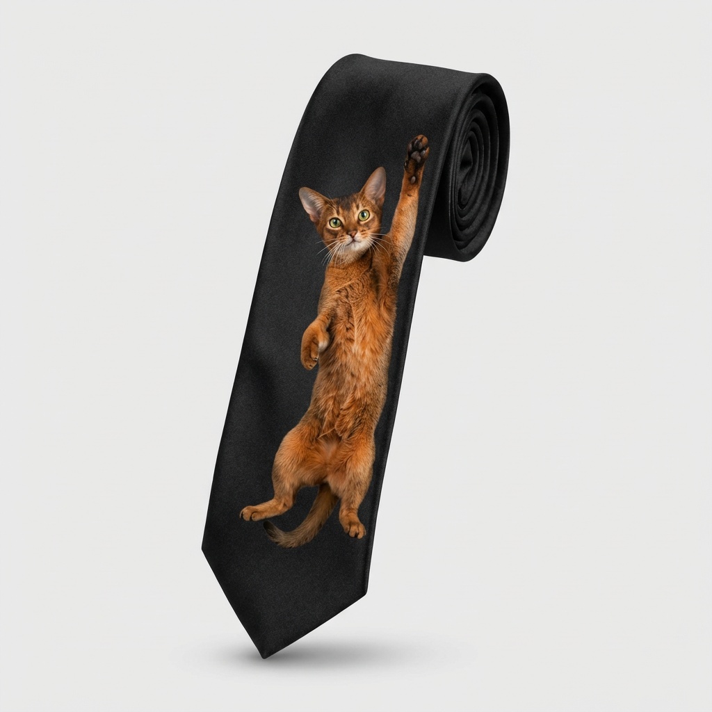 Cravatta di design presenta una stampa 3D realistica di gatto abissino in posa dinamica sospeso su base satinata nera. Gatto rossiccio con caratteristico ticking del pelo, occhi verdi espressivi e orecchie appuntite crea uno statement piece per gli amanti dei gatti. Realizzata in tessuto poliestere liscio con coloranti resistenti che mantengono l’intensità dei colori.