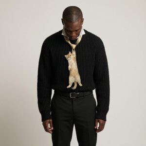 Cravatta con stampa realistica di gatto britannico nel mantello golden combina eleganza con accento sottile per gli amanti degli animali. Il gatto beige-dorato presentato in posa naturale si estende sulla superficie della cravatta, creando un insieme cromatico armonioso. Realizzata in tessuto satinato liscio che garantisce comfort per tutto il giorno.