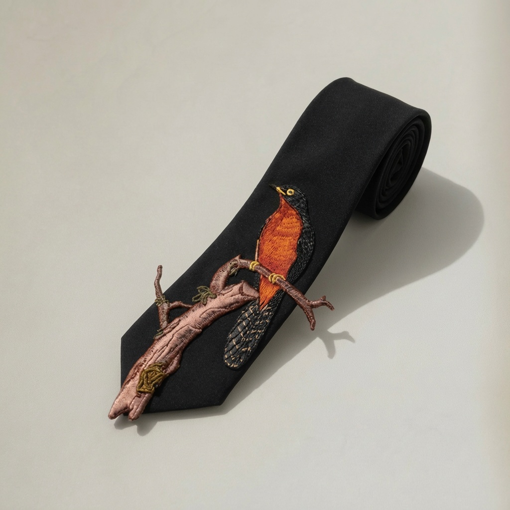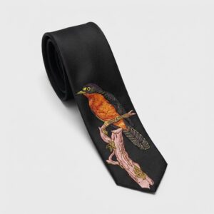 La cravatta nera con uccello ricamato presenta una composizione ispirata alle illustrazioni naturalistiche. L’uccello dal petto intensamente arancione e dalle ali scure riposa su un ramo rosa-marrone con foglioline verde oliva. Il tessuto satinato in poliestere premium costituisce uno sfondo elegante per il ricamo preciso che riproduce ogni dettaglio delle piume.