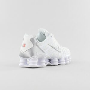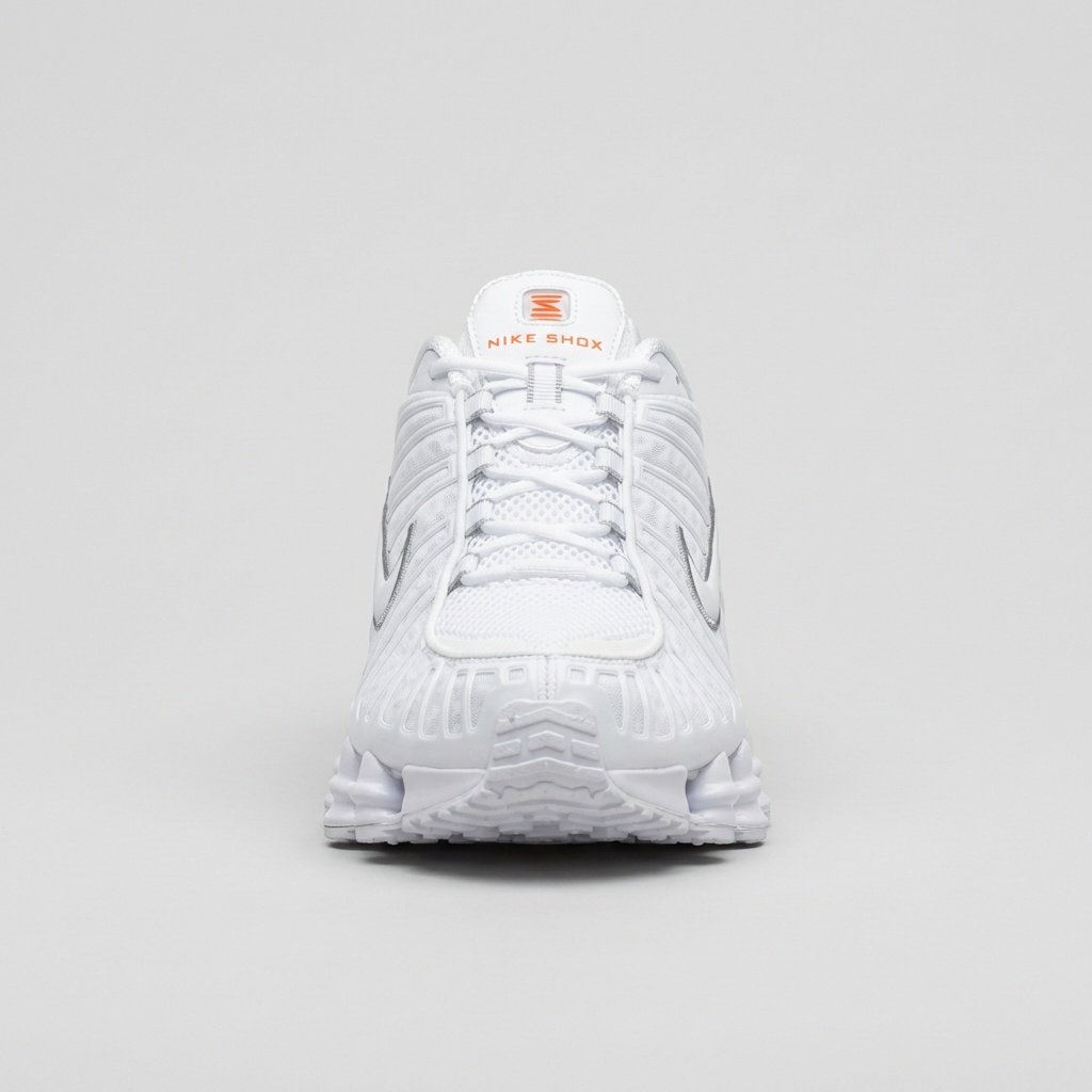 Le Nike Shox TL sono scarpe sportive classiche che si distinguono per la caratteristica suola con colonne Shox. La colorazione bianca è completata da dettagli metallici in tonalità argento e accenti arancioni. Realizzate con una combinazione di materiale tessile e materiali sintetici, offrono durabilità e funzionalità.