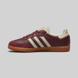 ADIDAS SAMBA OG è un modello iconico di scarpe da calcio che ha conquistato lo status di icona streetwear. Realizzate in pelle naturale di alta qualità in intenso colore bordeaux, completate da elementi scamosciati sulla punta e sul tallone. Le caratteristiche tre strisce color crema sottolineano l’eredità del marchio.