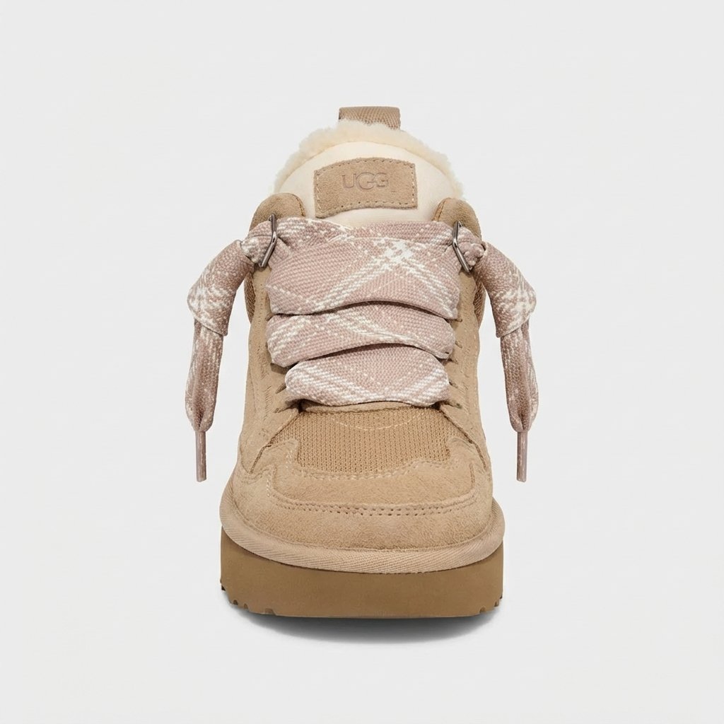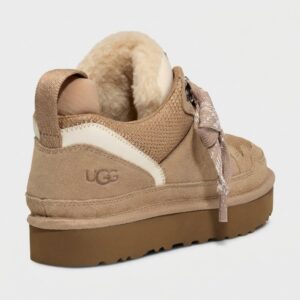 Le sneakers UGG Lowmel uniscono il comfort dell’uso quotidiano al design caratteristico del brand. Realizzate in pelle scamosciata di alta qualità color sabbia, sono dotate di fodera riscaldante e suola platform. I lacci decorativi con finitura metallizzata conferiscono al modello un sottile accento stilistico.