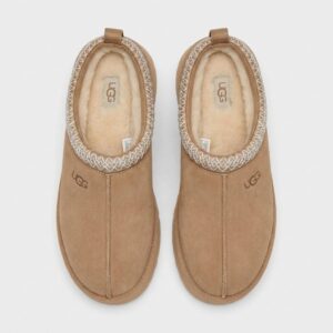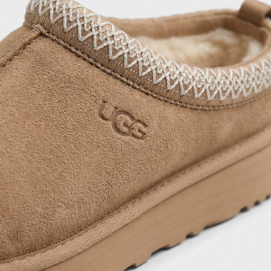 Pantofole UGG Tazz color sabbia in lana naturale e camoscio. La suola spessa in EVA garantisce comfort e stabilità. L’imbottitura in lana merino assicura calore nelle giornate più fresche.