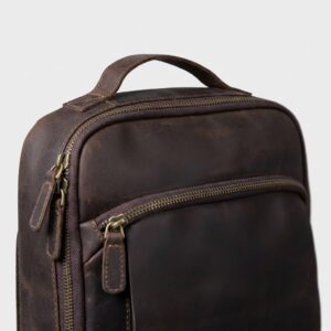 Zaino realizzato in pelle naturale che combina funzionalità con un design vintage senza tempo. Dotato di scomparto principale e tasche aggiuntive frontali, garantisce una comoda organizzazione degli oggetti. Spallacci regolabili e robuste chiusure con cerniera assicurano comodità d’uso.