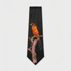 Zwarte stropdas met geborduurde vogel toont een compositie geïnspireerd door natuurhistorische illustraties. Vogel met intensief oranje borst en donkere vleugels rust op een roze-bruine tak met olijfgroene blaadjes. Satijnen polyester premium stof vormt een elegante achtergrond voor het precieze borduurwerk dat elk detail van de veren weergeeft.