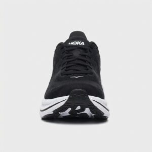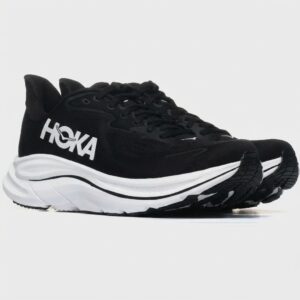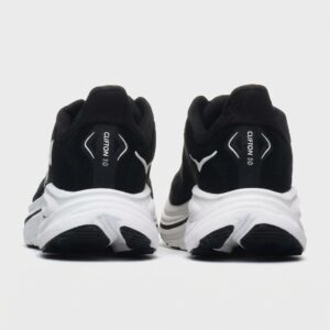Hardloopschoenen HOKA Clifton 10 onderscheiden zich door de dikke middenzool die effectieve demping biedt tijdens training. Het bovenwerk combineert textiel materiaal met synthetische elementen, wat duurzaamheid en voetondersteuning garandeert. Het contrasterende witte HOKA logo valt op tegen de zwarte achtergrond van het bovenwerk.