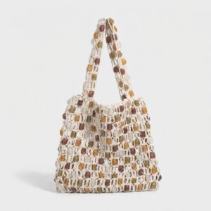 Handgevlochten shopper bag van polyester koord combineert functionaliteit met artistiek design. Crème basis versierd met veelkleurige elementen in bruine, beige en oranje tinten creëert een karakteristiek patroon. Koordsluiting zorgt voor veiligheid van de inhoud met behoud van gemakkelijke toegang.