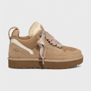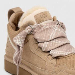 Sneakers UGG Lowmel combineren dagelijks draagcomfort met het karakteristieke design van het merk. Gemaakt van hoogwaardig suède in zandkleur, uitgerust met warmhoudende voering en platformzool. Decoratieve veters met metallieke glans geven het model een subtiel stylistisch accent.