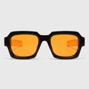 Zonnebril met karakteristieke oranje glazen en UV400 filter die volledige bescherming biedt tegen ultraviolette straling. Montuur gemaakt van duurzaam polycarbonaat in matte zwarte afwerking, aangevuld met gradiënt pootjes in oranje tinten. De vierkante vorm van de glazen geeft het model een moderne, geometrische uitstraling.